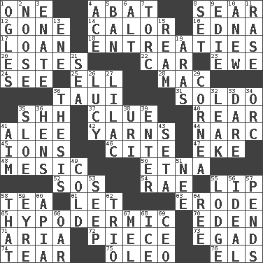 ACROSS 1. Single 4. Blind as ____ 8. Wither 12. Went 14. Bodily heat indicating an inflammation 16. Pulitzer Prize-winning author Ferber 17. Grant temporary use of 18. Pleas 20. _____ Park, CO 22. Automobile 23. She-sheep 24. Perceive with the eye 25. Pipe bend 28. Big _ 30. "Change" in Tahitian 31. Twentieth part of a lira 35. Quiet! 37. A slight indication 40. Posterior 41. Toward shelter 42. Tall tales 44. Drug cop 45. Charged atoms 46. Quote 47. Supplement with great effort 48. Mesonic 50. Inactive volcano in Sicily 52. Mayday 54. Actress Charlotte 55. Mouth edge 58. Afternoon social gathering 61. Allow 63. Eat (away) 65. Under the skin 70. Genesis locale 71. Operatic vocal solo 72. Part 73. Mild oath 74. Separate forcefully 75. Margarine 76. Raised railways DOWN 1. Stares at amorously 2. Trap for birds or small mammals 3. Maternal 4. Adept person 5. Forbid 6. The first octave above the treble staff 7. Torque (variant) 8. Put into a specified state 9. Singer Brickell 10. Afresh 11. To erase 13. Compass dir. 15. 480, 500 or 516 sheets of paper 19. Caspian sea tributary 21. Ocean 26. "I Love _" 27. Pale purple color 29. Pupil covering 30. College paper 32. Path through which fluid escapes 33. Have the gumption 34. The grampus (Milton) 35. A type of plum 36. Coop moms 38. RI univ. 39. Keyboard key 41. Direct toward a target or goal 43. Bristle 49. Chilled 51. Born 53. Ooze 55. Inn 56. Perfect 57. Hangs 58. Not this but _ 59. Jane of fiction 60. Capital of Western Samoa 62. Musical group of three 64. To separate or throw off 66. Boat paddle 67. Cartoonist voice _ Blanc 68. Frozen water 69. Corporate head (abbr.)
