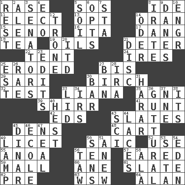 ACROSS 1. Raze (variant) 5. Mayday 8. Binary compound 11. Voters do this 13. Choose 14. Northwest Algerian city 15. Sir (Sp.) 16. Call ___ day 17. Mild oath, euphamism for damn 18. Afternoon social gathering 19. Petroleums 21. Prevent from occurring 22. Portable shelter 24. Angers 25. Eaten away 27. Altar cloth linen 29. Indian skirt 30. A tree used for making furniture 32. Trial 33. Woody, climbing, usually tropical plant 35. Hindu god of fire 39. Bake eggs in their shells 41. The smallest animal of a litter 42. Begley and Asner 43. Chalkboards 45. Cub Scout units 48. Heavy open wagon 49. It is permitted: Lat. 50. Ketch in the Levant 52. Purpose 55. Small Philippine buffalo 56. "___ Little Indians" 57. Having ears or earlike features 59. Promenade 60. One (Scot) 61. Chalkboard 62. Before (prefix) 63. Compass dir. 64. ____ Jay Lerner DOWN 1. Take ten 2. Toward shelter 3. Elected representatives 4. Environmental prefix 5. Land 6. Elects 7. R.R. building 8. Feeling or showing extreme anger 9. Natives or inhabitants of Denmark 10. Engineer (abbr.) 12. Marketplace scale 14. River in Europe 20. It would 21. Flat circle 23. Prepares for publication 25. Eastern Standard Time (abbr.) 26. Actress Charlotte 27. Storage container 28. Retirement account (abbr.) 30. Tavern 31. Ethiopian city, capital of Harari 33. Flaplike covering 34. Big collection agency 36. From the throat 37. Compass dir. 38. ___ a Wonderful Life 40. Behest 43. _-fi 44. Shoestrings 45. Middle Eastern gold or silver currency 46. Learning spot: Fr. 47. Be tempered by heat 49. Desk light 50. Elected reps. 51. Afresh 53. Bristle 54. Paradise 56. The 23rd letter of the Hebrew alphabet 58. Insect wing