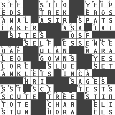 ACROSS 1. Perceive with the eye 4. Grain storage tower 8. Sharp bark 12. Begley and Asner 13. Long journey 14. Greek god of love 15. Of or related to the anus 17. SW Saudi Arabia district 18. Arguments over trivial matters 19. Member of a famous L.A. basketball team 21. White ___ sheet 23. Make lace 24. Settings 26. Order of Saint Francis (abbr.) 28. Oneself 30. Substance 34. Clumsy lout 37. Uhlan (variant) 39. Hindu Mythology: god of death 40. Lion 41. Brides' dresses 43. Affirmative reply 44. Old wives' tales, e.g. 46. Change direction abruptly 47. Put into a specified state 48. Short socks 51. South American Indian 54. Medical imaging device (abbr.) 55. Gurus 58. Fast jet (abbr.) 61. _-fi 63. Trials 65. Scutum 67. Relationship diagram 71. Commotion 72. Haul 73. Burn to charcoal 74. Connecticut Ivy Leaguer 75. Astound 76. Israeli folk dance 77. Raised railways DOWN 1. Lick closed 2. Ferber et al. 3. 1973 Nobel Price Winner (Physics) Leo 4. R.R. building 5. Big collection agency 6. Flowery wreath 7. Gumbo ingredient 8. Slangy assent 9. Part of Q.E.F. 10. Globular water bottle used in Asia 11. Inconspicuous attention getter 16. Allows 18. Backtalk 20. To riddle 22. Distress signal 25. Strike heavily 27. Opposite of masc. 29. Soft thread for cleaning between teeth 30. World-weariness 31. Negative votes 32. Algonquian 33. Compass direction 34. Water jar 35. Age 36. Tined utensil 38. Leather borer 42. Elected reps. 45. Shade tree 49. Celtic language 50. Nervous spasm 52. Domesticated feline 53. Grows older 56. First name in cosmetics 57. Not moving 58. Fast planes 59. Highlander 60. Ballerina skirt 62. Hankering 64. Indian titles of respect 66. "___ Little Indians" 68. 17th letter of the Greek alphabet 69. Hearing organ 70. Period