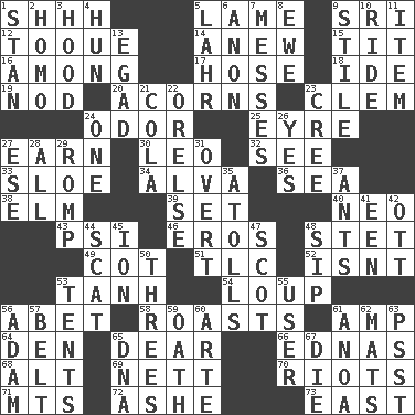 ACROSS 1. Quiet! 5. Unable to walk 9. _ Lanka 12. Woman's close-fitting hat 14. Afresh 15. Teat (slang) 16. Amid 17. Flexible conduit 18. Binary compound 19. Dreamland 20. Oak nuts 23. Clement's nick name 24. Scent 25. Jane of fiction 27. Merit 30. Lion 32. Perceive with the eye 33. A type of plum 34. Inventor's middle name 36. Ocean 38. Shade tree 39. Arrange properly for use 40. Modern: prefix 43. 23rd letter of the Greek alphabet 46. Greek god of love 48. Proofreading order 49. Small bed 51. Affectionate concern, for short 52. Is not 53. Hyperbolic tangent 54. Central Nebraska county 56. Collude with 58. Ridicules or criticizes harshly 61. Electrical Unit 64. Lair 65. Letter starter 66. Ferber et al. 68. The first octave above the treble staff 69. Remaining after all deductions 70. Debaucheries 71. Mountains (abbr.) 72. American tennis player Robert 73. Compass direction DOWN 1. Comedian Laurel of Laurel & Hardy 2. Same (prefix) 3. Parka part 4. Attila the _ 5. Cowardly lion portrayer 6. Soon (poet.) 7. Makes clutter 8. She-sheep 9. Vertical member of a panel or frame 10. Travel on or in a vehicle 11. A distinct part 13. Mild oath 21. Root beer relative 22. Threatening words 23. Algonquian 24. Single 26. Affirmative reply 27. Compass dir. 28. 100% 29. Play 31. Unconcealed 35. Ringlike coral islands and reefs 37. Pismires 41. Car or cant ending 42. Baseball player Mel 44. Jazz singing style 45. Electrically charged atom 47. Highlander 48. Small drink 50. Triads 53. Portable shelters 55. One who uses or employs something 56. First man 57. Waist strap 59. Pledge 60. Johnson of "Laugh-In" 61. Small Philippine buffalo 62. Floor coverings 63. Inconspicuous attention getter 65. Heredity factor (abbr.) 67. Expire