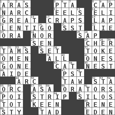 ACROSS 1. Ancient river in northeast Turkey 5. Parent Teacher Assoc. 8. Head covering 11. Drug cop 12. Snakelike fish 14. Connecticut Ivy Leaguer 15. Relatively large 17. Dice game 18. Pet locale 19. Small, flat, pigmented spot on the skin 21. Fast jet (abbr.) 22. Whopper 23. Mouth or opening 24. Not either 25. Plant excrement 27. Elected rep. 28. "Mermaids" star 31. Scottish caps 35. Put into a specified state 37. Casino tip 38. Sign of something about to happen 39. Everything 41. Washington bills 42. Went 43. Domesticated feline 45. Egg locale 46. Assistant 47. Pacific Standard Time (abbr.) 49. Curve 51. The 23rd letter of the Hebrew alphabet 52. R.R. building 55. The grampus (Milton) 57. White ___ sheet 60. Speakers 62. Luau course 63. Remove all contents or possession from 65. Grain storage towers 66. Small child 67. Peachy ____! 68. French philosopher Descartes 69. Filthy place 70. Bit 71. Locale of original sin DOWN 1. White American of non-Hispanic descent 2. More uncommon 3. Sports stadium 4. Go away! 5. For each 6. Beverages made from leaves 7. High mountains 8. Portable communications device 9. Mountain range southwest of Kyrgyzstan 10. Corncob 13. Fast planes 16. Airtight sealed metal containers 17. Pupil covering 20. Moves 26. 13-14th century defensive garment 29. Supplements with great effort 30. Relief 31. Ancient Roman robe 32. Mine, in Marseilles 33. Ananias' fault 34. Scornful expression 36. Affectionate concern, for short 40. Portable computer 44. Russian ruler of old 48. It was, poetically 50. Keg 52. Having a sole or soles 53. Marketplace scale 54. NE Netherlands city 55. Chooses 56. Carrot, for example 58. Proofreading order 59. Type of rug 61. Hoop that covers a wheel 64. Indiana (abbr.)