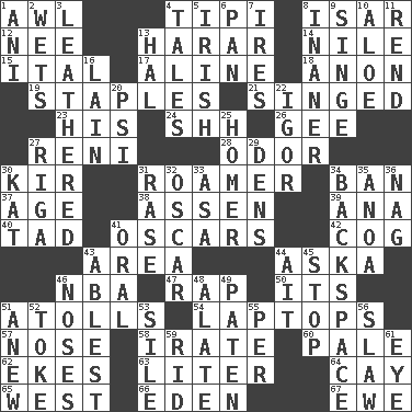 ACROSS 1. Leather borer 4. Native american tent (variation) 8. Austrian river, tributary to the Danube 12. Born 13. Ethiopian city, capital of Harari 14. Mediterranean tributary 15. Slanted text style (abbr.) 17. Place in a line 18. At once, immediately (arch.) 19. Paper fasteners 21. Scorched 23. Part of HMS, perhaps 24. Quiet! 26. Turn to the right 27. Painter Guido (1575-1642) 28. Aroma 30. Apertif with cassis 31. Nomad 34. Forbid 37. Personal question 38. NE Netherlands city 39. Santa ___, CA 40. Small boy 41. Motion picture awards 42. Gear tooth 43. Type of rug 44. "____ silly question..." 46. Basketball assoc. 47. Hit sharply and swiftly 50. It is 51. Ringlike coral islands and reefs 54. Portable computers 57. Characteristic smell of wine 58. Feeling or showing extreme anger 60. Diluted with white 62. Supplements with great effort 63. 61 cubic inches 64. Island 65. 270 degrees 66. Locale of original sin 67. She-sheep DOWN 1. Black tropical American cuckoo 2. Moistens 3. Resembling or made to resemble leather 4. Lies 5. From or relating to Ireland 6. Baking dish 7. Angers 8. More lacking in sense or substance 9. Scorch 10. Medicinal plant 11. Tear apart 13. Actor Linden 16. (Had) reclined 20. 23rd letter of the Greek alphabet 22. Russian composer Stravinsky 25. Simpsons dad 27. Port city in Latvia 29. Lairs 30. Krazy ___ of comics 31. To erase 32. Motion picture award 33. White ___ sheet 34. Keyboard key 35. Small Philippine buffalo 36. Tired old horse 41. Spoken 43. Most capable 44. Small island 45. Halt 46. Olfactory organs 48. Having winglike extensions 49. Eucharist need 51. Afresh 52. Casino tip 53. Filth; sediment 55. For each 56. Cole _ (cabbage dish) 59. To free from 61. Sight organ