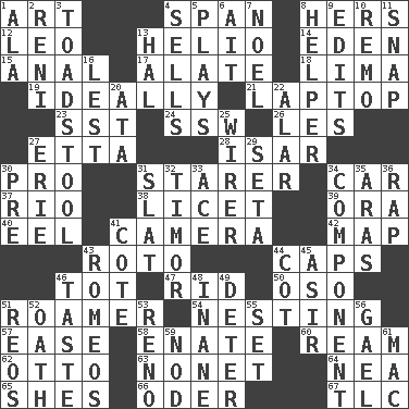 ACROSS 1. Tate display 4. Connect, as a bridge 8. Possessive pronoun 12. Lion 13. Sun: prefix 14. Locale of original sin 15. Of or related to the anus 17. Having winglike extensions 18. Pale green bean 19. Under perfect conditions 21. Portable computer 23. Fast jet (abbr.) 24. Compass dir. 26. French article 27. Singer James 28. Austrian river, tributary to the Danube 30. Adept person 31. A viewer who gazes fixedly 34. 4-wheeled motor vehicle 37. River (Sp.) 38. It is permitted: Lat. 39. Mouth or opening 40. Snakelike fish 41. Device for capturing images 42. Atlas unit 43. Printing process, for short 44. Smile enhancers 46. Small child 47. To free from 50. Bear (Spanish) 51. Wanderer 54. Snuggling 57. Comfort 58. Maternal 60. 480, 500 or 516 sheets of paper 62. "Beetle Bailey" pooch 63. Music written for nine 64. Teachers' org. 65. "______ My Girl" (Turtles hit) 66. Baltic tributary 67. Affectionate concern, for short DOWN 1. Chicken ___ king 2. Painter Guido (1575-1642) 3. Inedible or poisonous agaric 4. Exchanges for money 5. Live dramatic performances 6. Small island 7. Christmas carol 8. Aide 9. Proofreads 10. San ____ (Riviera town) 11. Fastener 13. Actor Linden 16. For fear that 20. _ moment's notice (2 wds.) 22. Having or resembling wings 25. One who wires 27. 4th largest of the Great Lakes 29. Stalk of a moss capsule 30. Before (prefix) 31. Narrow board 32. Southeast Indonesia island 33. Adept person 34. Part 35. Caspian sea tributary 36. Hit sharply and swiftly 41. ____ d'Azur (French Riviera) 43. Lover boys 44. Small bed 45. SW Saudi Arabia district 46. Clothes sense 48. Silly 49. Prevent from occurring 51. Vintage cars 52. Pledge 53. Western Nevada city 55. Put into a specified state 56. Highlander 59. Allow head to fall sleepily 61. Big _