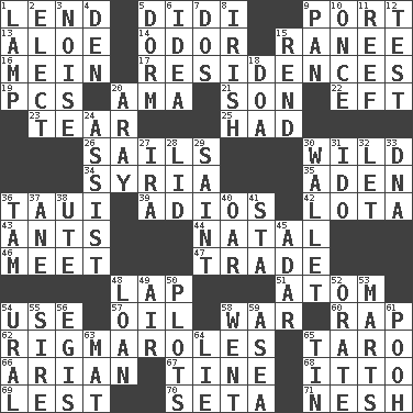 ACROSS 1. Grant temporary use of 5. "You Light Up My Life" star Conn 9. Sweet dark-red dessert wine 13. _ vera 14. Scent 15. Indian princess (variant) 16. Count _ (2 wds.) 17. Dwellings 19. Personal Computers (abbr.) 20. Housemaid (var.) 21. Male offspring 22. Lizard (obsolete) 23. Pull into pieces 25. Possessed 26. Moves on water 30. Rampant 34. Damascus' land 35. An important port of Yemen 36. "Change" in Tahitian 39. Goodbye (Sp.) 42. Globular water bottle used in Asia 43. Pismires 44. Brizilian seaport 46. Rendezvous 47. Exchange 48. Pet locale 51. Smallest unit of an element 54. Purpose 57. Lubricate 58. Armed conflict 60. Strike 62. Complicated, petty procedures 65. Edible starchy tuberous root 66. Believer in; advocate of (suffix) 67. Prong on a fork 68. "Tell ____ the Marines!" 69. For fear that 70. Bristle 71. Soft DOWN 1. Desk light 2. Opt 3. Annoying sound 4. Lair 5. Dormintory (informal) 6. It may be bright or harebrained 7. Two (Sp.) 8. From or relating to Ireland 9. Baking dish 10. At one time in the past 11. Coral collection 12. Trial 15. Tear apart 18. ___ good deed 20. Like ___ of sunshine 24. Aid 27. Retirement account (abbr.) 28. Flaplike covering 29. Inhabitant of Heaven 30. Place for singles 31. Wedding promise 32. Allow 33. Heredity factor (abbr.) 36. Scottish cap 37. A saturated hydrocarbon 38. Shoshoni 40. Rowing implement 41. R.R. building 45. The sixth month of the Jewish calendar 48. Grant temporary use of 49. Wind 50. Graphs 52. Declaim 53. Shops 54. Mountain range 55. Father 56. Armor plate that protects the chest 58. Left 59. At sea 61. "Silly old bear" 63. Floor protector 64. Untruth 65. Shallow baking pan