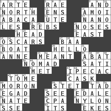 ACROSS 1. Johnson of "Laugh-In" 5. Actress Charlotte 8. Plus 11. 0 degrees 13. Followers of ems 14. Mine, in Marseilles 15. Phillipine bananalike plant 16. Shoshoni 17. Billionth: prefix 18. French article 19. Confederate soldiers (slang) 21. Olfactory organs 22. Froth on beer 24. 90 degrees 25. Motion picture awards 27. Sound made by sheep 29. Water vessel 30. Phone greeting 32. Queen of England 1702-14 33. Intended 35. Blind as ____ 39. Wanderer 41. Suttee (variant) 42. Was introduced to 43. Medicinal drug used to evoke vomiting 45. Heavy book 48. Keg 49. Person of subnormal intelligence 50. Proofreading order 52. Small boy 55. Mild oath 56. Perceive with the eye 57. Peak District village in England 59. Nathan's nickname 60. Numbers guy (abbr.) 61. High-strength synthetic material 62. Compass dir. 63. It is 64. Supplements with great effort DOWN 1. Of or related to the anus 2. Loose flowing garment 3. File 13 4. And so on (abbr.) 5. Reuben's nickname 6. Pismires 7. Compass dir. 8. Collect or gather 9. Music written for nine 10. "Vaya con ____" 12. Ethiopian city, capital of Harari 14. Small Philippine buffalo 20. Begley and Asner 21. Be tempered by heat 23. Consumed 25. Chief or king in Benin or Nigeria 26. Manchild 27. Benjamin's nick name 28. The first octave above the treble staff 30. Possessed 31. Fertile tracts in a desert 33. Madame (abbr.) 34. Ingest 36. Sass 37. _ moment's notice (2 wds.) 38. Nervous spasm 40. Sign of things to come 43. Frozen water 44. Eucharist need 45. Ancient Roman robes 46. Declaim 47. Method 49. Not women's 50. Back-to-school mo. 51. Afternoon social gatherings 53. _ vera 54. Lairs 56. _-fi 58. Color