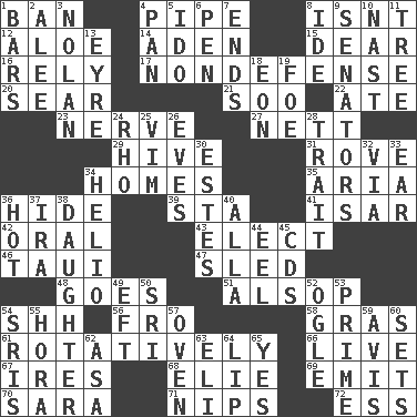 ACROSS 1. Forbid 4. Corncob 8. Is not 12. _ vera 14. Arabian gulf 15. Letter starter 16. Depend 17. Unrelated to defense, as in spending 20. Shrivel 21. "Barney Miller" actor Jack 22. Had dinner 23. Impudent aggressiveness 27. Remaining after all deductions 29. Hub of activity 31. Be footloose 34. Residences 35. Roberta Peters solo 36. Flintstone garb 39. R.R. building 41. Austrian river, tributary to the Danube 42. Relating to the mouth 43. Opt 46. "Change" in Tahitian 47. Downhill vehicle 48. Leaves 51. Columnist Joseph or Stewart 54. Quiet! 56. Away 58. Pate de foie ____ 61. Rotating or pertaining to rotation 66. Not recorded 67. Angers 68. Writer Wiesel 69. Send forth 70. "Two Mules for Sister ____" 71. Cuts off 72. Double-curved letter DOWN 1. Soap units 2. Toward shelter 3. Pitcher Ryan 4. Baking dish 5. Wedding promise 6. Animal enclosure 7. Extremities 8. Binary compound 9. Elected representatives 10. Political cartoonist Thomas 11. Relationship diagram 13. Jane of fiction 18. A really long time 19. Enemy 24. 17th letter of the Greek alphabet 25. Zeal 26. Nights before holidays 28. Distinguishing feature 30. _____ Park, CO 32. By way of 33. Ewer handle 34. Sun: prefix 36. Being at a high temperature 37. Retirement account (abbr.) 38. Female child 40. Silent film actress Nazimova 44. Snakelike fish 45. Music discs 49. Lizard (obsolete) 50. _ Lanka 52. Stare at amorously 53. A-one 54. Indian titles of respect 55. Israeli folk dance 57. Baking chamber 59. Opinion 60. Puts into a specified state 62. White ___ sheet 63. Biblical high priest 64. Mouth edge 65. It is so