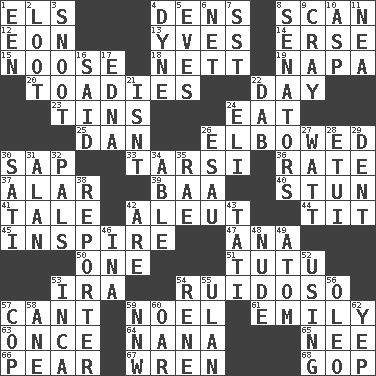 ACROSS 1. Raised railways 4. Habitations of wild animals 8. Glance over 12. Period of immesurable duration 13. Jacques Cousteau's middle name 14. Celtic language 15. Trap for birds or small mammals 18. Remaining after all deductions 19. California wine valley 20. Sycophants 22. 24 hours 23. Airtight sealed metal containers 24. Ingest 25. One of the 12 tribes of Israel 26. Shoved, as through a crowd 30. Plant excrement 33. Tarsus (plural) 36. Assign a rank or rating to 37. Having or resembling wings 39. Sound made by sheep 40. Surprise greatly 41. Story 42. Native American of Southwest Alaska 44. Teat (slang) 45. Stimulate to action 47. Santa ___, CA 50. Single 51. Ballerina skirt 53. Lyricist Gershwin 54. Noisy, rowdy, vocal (Spanish) 57. Patter 59. Christmas carol 61. Poet Dickinson 63. Single time 64. Grandmother 65. Born 66. Lightbulb-shaped fruit 67. Songbird 68. Republican Party DOWN 1. Car or cant ending 2. Spoils 3. Snob 4. Centimeter-gram-second unit of force 5. Nights before holidays 6. Fish or hair follower 7. Fast jet (abbr.) 8. Elected representatives 9. Supercomputer manufacturer 10. Cleo's killer 11. Teachers' org. 16. Expressed in words 17. Pulitzer Prize-winning author Ferber 21. Is not 22. Pat or tap gently 24. Connecticut Ivy Leaguer 26. He sold his birthright 27. Electrical Unit 28. Needle holder 29. Scratch 30. Suttee (variant) 31. Actor Alda or Thicke 32. Friends 34. Competent 35. Actress Charlotte 38. News announcer 42. "We ___ not amused" (Victoria) 43. Jacques of French films 46. _ tizzy (2 wds.) 48. Unadorned 49. Smallest unit of an element 52. Exploiting 53. South American Indian 54. French philosopher Descartes 55. ____ Bator, Mongolia 56. Butter sub 57. Police officer (slang) 58. A saturated hydrocarbon 59. Compass dir. 60. Boat paddle 62. Slangy assent