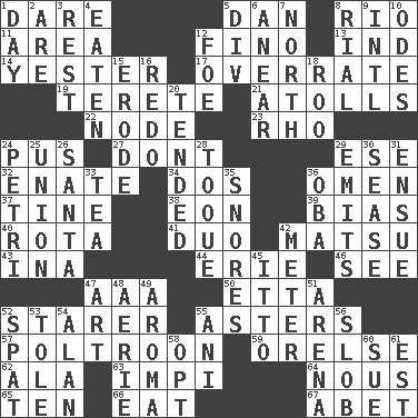 ACROSS 1. Have the gumption 5. Daniel's nick name 8. River (Sp.) 11. Length times width 12. A pale, very dry sherry 13. Working for oneself (abbr.) 14. Of or pertaining to yesterday 17. Make much ado about nothing 19. Cylindrical with tapered ends 21. Ringlike coral islands and reefs 22. Thickened enlargement 23. 17th letter of the Greek alphabet 24. Festering 27. Do not 29. Compass dir. 32. Maternal 34. Two (Sp.) 36. Presage 37. Prong on a fork 38. Age 39. Prejudice 40. Roll call or roster of names 41. Superhero pair 42. Taiwanese island in East China Sea 43. _ tizzy (2 wds.) 44. 4th largest of the Great Lakes 46. Perceive with the eye 47. American Automobile Association (abbr.) 50. Singer James 52. A viewer who gazes fixedly 55. Michaelmas daisies 57. Coward 59. Threatening words 62. Chicken ___ king 63. Body of Kaffir warriors 64. Horse sense 65. Nine, plus one 66. Erode 67. Collude with DOWN 1. 24 hours 2. "We ___ not amused" (Victoria) 3. Relief 4. Eroded 5. HTML Container Element 6. Approach 7. _ pole 8. Monetary unit of Yemen 9. International (abbr.) 10. Lyric poems 12. Enemy 15. Eat (away) 16. Do over again 18. Friend of Pooh 20. Watched over 24. _ dish (used to culture cells) 25. The state of being joined or united 26. Before Barbara or Clara 28. Woman's close-fitting hat 29. Sends forth 30. Gospel singer Marvin 31. Follow as a consequence or result 33. Afternoon social gathering 35. Sounds asleep 36. Chief or king in Benin or Nigeria 42. Distance measurement 45. "Tell ____ the Marines!" 47. Tate display 48. Nest on high 49. Scent 51. Sports stadium 52. Petty quarrel 53. Lacquered or enameled metalware 54. ____ Jay Lerner 55. Black tropical American cuckoo 56. Oscar Madison type 58. Elect 60. Take to court 61. Eastern Standard Time (abbr.)