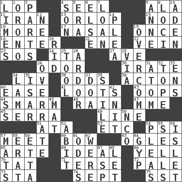 ACROSS 1. Trim (branches) 4. Stitch closed the eyes of (a falcon) 8. According to 11. SW Asia republic 13. Lowest deck of a ship 15. Allow head to fall sleepily 16. Greater amount 17. Relating to the nose 18. At one time in the past 19. Keyboard key 21. Compass dir. 22. Distinctive style or manner 23. Distress signal 24. Call ___ day 27. "___ Maria" 29. Scent 30. Feeling or showing extreme anger 34. 54 in ancient Rome 36. Likelihood 39. NE Massachussets city 40. Relaxation 41. Plunders 43. I made a mistake 44. Excessive but superficial compliments 46. Precipitation 47. Madame (abbr.) 48. Spanish missionary in California 49. Actor's bit 51. "One Day ___ Time" 53. And so on (abbr.) 54. Air pressure measure (abbr.) 57. Confront 60. Ribbon knot 63. Stares at amorously 65. Johnson of "Laugh-In" 66. Standard of perfection 69. Shout 70. Make lace 71. Laconic 72. Diluted with white 73. R.R. building 74. Back-to-school mo. 75. Fast jet (abbr.) DOWN 1. Citrus fruits 2. U. of Maine site 3. Actors' quests 4. Male offspring 5. Epoch 6. Otherwise 7. Grant temporary use of 8. Singer Murray 9. Locales 10. An important port of Yemen 12. Born 14. Entreaty 18. Conquer 20. To free from 25. Instrument 26. Zeal 28. By way of 29. Make much ado about nothing 31. Smallest unit of an element 32. Drink excessively 33. Followers of ems 34. Unable to walk 35. Austrian river, tributary to the Danube 37. ___ good deed 38. Vertical member of a panel or frame 40. Curvy letter 42. In a ____ (agitated or irritated) 45. Floor protector 50. Non-commissioned officer (abbr.) 52. "This won't hurt ____!" 54. Entreaties 55. Makes a sale 56. Small island 57. Floor protectors 58. Part of Q.E.F. 59. Singer James 61. Lyric poems 62. Past tense of be (plural) 64. Con 67. Viper 68. Allow
