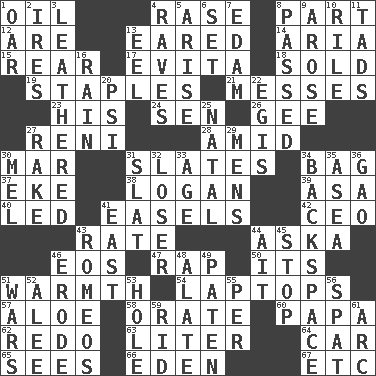 ACROSS 1. Lubricate 4. To erase 8. Role in a play 12. "We ___ not amused" (Victoria) 13. Having ears or earlike features 14. Operatic vocal solo 15. Buttocks 17. Webber/Rice musical 18. Disposed of to a purchaser 19. Paper fasteners 21. Makes clutter 23. Part of HMS, perhaps 24. Elected rep. 26. Turn to the right 27. Painter Guido (1575-1642) 28. Among 30. Make imperfect 31. Chalkboards 34. Paper or plastic container 37. Make supply last 38. Utah city north of Ogden 39. White ___ sheet 40. Directed 41. Artist's stands 42. Corporate head (abbr.) 43. Pace 44. "____ silly question..." 46. Greek goddess of the dawn 47. Hit sharply and swiftly 50. ___ a Wonderful Life 51. Heat 54. Portable computers 57. _ vera 58. Declaim 60. Dad 62. Make new 63. 61 cubic inches 64. 4-wheeled motor vehicle 65. Observes 66. Paradise 67. And so on (abbr.) DOWN 1. Rowing implement 2. Angers 3. Resembling or made to resemble leather 4. All-night dance parties 5. Get up 6. Arrange properly for use 7. Dutch treat 8. Went by 9. Came up 10. Cause heat under the collar 11. Bits 13. Snakelike fish 16. Water falling in drops from the sky 20. Air pressure measure (abbr.) 22. Armor plate that protects the chest 25. Brizilian seaport 27. Libertine 29. Not women's 30. Cartoonist voice _ Blanc 31. Narrow board 32. Failure 33. Personal question 34. Keyboard key 35. Toward the sea 36. E Mali city 41. Compass direction 43. Lover boys 44. Small island 45. Halt 46. Wear away 48. Having winglike extensions 49. Eucharist need 51. Armed conflicts 52. Toward shelter 53. Hollow 55. For each 56. Petty quarrel 59. To free from 61. Curve