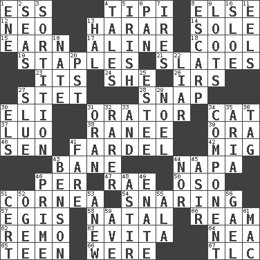 ACROSS 1. Curvy letter 4. Native american tent (variation) 8. Otherwise 12. Modern: prefix 13. Ethiopian city, capital of Harari 14. Not divided or shared with others 15. Merit 17. Place in a line 18. Calm and collected 19. Paper fasteners 21. Chalkboards 23. ___ a Wonderful Life 24. A female animal or person 26. Big collection agency 27. Proofreading order 28. Fastener 30. Connecticut Ivy Leaguer 31. Speaker 34. Feline 37. Nilotic language 38. The wife of a rajah (variant) 39. Mouth or opening 40. Elected rep. 41. Burden 42. Russian fighter aircraft 43. Object of repulsion 44. California wine valley 46. For each 47. Actress Charlotte 50. Bear (Spanish) 51. Pupil covering 54. Catching in a trap 57. Armor plate that protects the chest 58. Relating to or accompanying birth 60. 480, 500 or 516 sheets of paper 62. San ____ (Riviera town) 63. Webber/Rice musical 64. Teachers' org. 65. Adolescent 66. We are 67. Affectionate concern, for short DOWN 1. Compass dir. 2. Oceans 3. Drawing lots 4. Falsehoods 5. From or relating to Ireland 6. Baking dish 7. Angers 8. Fortification 9. Plunders 10. _ gin 11. Snakelike fish 13. Actor Linden 16. Nathan's nickname 20. Pacific Standard Time (abbr.) 22. One who doesn't tell the truth 25. First name in cosmetics 27. Change direction abruptly 29. Christmas carol 30. Raised railways 31. NW Algerian seaport 32. More valued for its uncommonness 33. Plus 34. Piece 35. Operatic vocal solo 36. Label 41. Conductor's collection 43. Gillaume's butler role 44. And not 45. SW Saudi Arabia district 46. A-one 48. Having gotten out of bed 49. Maternal 51. Foregone conclusion 52. Double curve, resembling the letter S 53. Afresh 55. In the manner of 56. Highlander 59. "___ Maria" 61. Big _