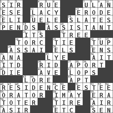 ACROSS 1. Title for a knight 4. Sorrow 7. ____ Bator 11. Compass dir. 12. Made of lace 13. Eat (away) 14. Connecticut Ivy Leaguer 15. Ubangi River tributary 16. Chalkboards 17. Hangs 19. Helper 21. It is 23. Relationship diagram 24. Torque (variant) 25. Standoff 26. Uncastrated adult male sheep 29. Slender Brazilian palm 30. Raised railways 31. Followers of ems 32. Santa ___, CA 33. Potassium hydroxide 34. Small island 35. It would 36. To free from 37. To the left, to Queeg 40. Pass on 41. "___ Maria" 42. Chops off 43. Old wives' tales, e.g. 45. Fitting 46. Dwelling 51. First name in cosmetics 55. Speaker 56. "If ____ say so..." 58. Epoch 59. Carrier 60. Hoop that covers a wheel 61. Atmosphere 62. SW Saudi Arabia district 63. And so on (abbr.) 64. Elected rep. DOWN 1. Ooze 2. Capri or Wright 3. It's straight from the horse's mouth 4. Actress Charlotte 5. Southern CA. univ. 6. Snake ____ (dice throw) 7. A salt of uric acid 8. Globular water bottle used in Asia 9. Arabian gulf 10. Egg locale 12. A period of five years 13. Otherwise 16. Male parents of animals 18. "Vaya con ____" 20. Vertical member of a panel or frame 22. _-fi 24. Sadhe (variant) 25. Miss Universe 1986, Barbara Palacios _ 26. Pulls into pieces 27. A single undivided whole 28. Pacific Standard Time (abbr.) 29. Against 32. Assist 33. Make or become more lively 36. More valued for its uncommonness 37. In the manner of 38. Wimpy's pal 39. Chooses 43. 61 cubic inches 44. Scent 46. Round or rotation of duties 47. Greek god of love 48. Suttee (variant) 49. Quote 50. Give off 52. Afternoon social gatherings 53. One of the Great Lakes 54. Merit 57. Curve