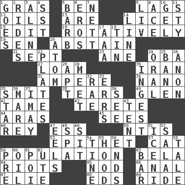 ACROSS 1. Pate de foie ____ 5. Benjamin's nick name 8. Fails to keep up a pace 12. Lubricates 13. "We ___ not amused" (Victoria) 14. It is permitted: Lat. 15. Prepare for publication 16. Producing rotation 19. Elected rep. 20. Refrain by choice 21. Back-to-school mo. 23. One (Scot) 24. Chief or king in Benin or Nigeria 27. Rich soil 30. SW Asia republic 31. Electrical Unit 34. Billionth: prefix 35. Stricken, poetically 38. Rends 40. Small, secluded valley 41. Docile 42. Cylindrical with tapered ends 44. Caspian sea tributary 45. Perceives with the eye 46. Marina Del _, California 47. Curvy letter 50. Nuclear Threat Initiatives 53. Curse 57. Domesticated feline 59. Census information 63. Actor Lugosi 64. Debaucheries 65. Dreamland 66. Of or related to the anus 67. Writer Wiesel 68. Begley and Asner 69. Travel on an animal DOWN 1. Travels 2. Amusement-park features 3. Place in a line 4. Fast jet (abbr.) 5. Sharp remark 6. Greek god of love 7. Remaining after all deductions 8. 54 in ancient Rome 9. Adept person 10. Set 11. Filthy place 14. Actor's bit 17. American Automobile Association (abbr.) 18. Metal container 20. Tiny particle 22. Food holders 24. Taken by mouth 25. Object of repulsion 26. Soon (poet.) 28. Fitting 29. Rendezvous 30. Consume 32. Actress Charlotte 33. Blunders 35. Play the lead 36. Female horse 37. "If ____ say so..." 39. Perceive with the eye 43. Portable shelter 47. Snakelike fish 48. Health resort 49. Be seated 51. Ancient Celtic tribe of eastern Britain 52. First course 54. Prong on a fork 55. Parka part 56. Extremities 58. Falsehood 59. Before (prefix) 60. Petroleum 61. Luau course 62. Shoshoni 63. Long, evenly shaped piece