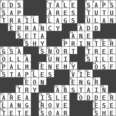 ACROSS 1. Begley and Asner 4. Falsehood 8. Plant excrements 12. Plant excrement 13. Ancient Greek god of war 14. Ballerina skirt 15. Lag or linger behind 18. Straggles 19. ____ Bator 20. Tendancy to err 22. Increase 23. Stalk of a moss capsule 24. A saturated hydrocarbon 25. Like a shrinking violet 26. Hard copy producer 30. Girls' org. (abbr.) 33. Derisive sound 36. Woody plant 37. Rounded earthenware pot or jar 39. Single; one (prefix) 40. Filth; sediment 41. Inside of hand 42. Foe 44. Order of Saint Francis (abbr.) 45. Paper fasteners 47. Compete 50. Period of immesurable duration 51. Engineer (abbr.) 53. Attempt to accomplish something 54. Refrain by choice 57. Length times width 59. Capri or Wright 61. More peculiar 63. Austrian-born American filmmaker Fritz 64. Be footloose 65. Compass dir. 66. False hair 67. Fly high 68. A female animal or person DOWN 1. Eastern Standard Time (abbr.) 2. Have the gumption 3. Practice fights 4. Baby powder 5. Like ___ of sunshine 6. Part of a journey 7. Curvy letter 8. SAT takers 9. Old (Scot.) 10. Parent Teacher Assoc. 11. Player for Phoenix 16. Angers 17. Thin strip of wood or metal 21. Negative votes 22. Black tropical American cuckoo 24. Tate display 26. Demure 27. Musical group of three 28. Snakelike fish 29. Coral collection 30. Republicans 31. Narrow board 32. Silent film actress Nazimova 34. Religious women 35. Single 38. Electrical Measurement 42. Car or cant ending 43. Jacques Cousteau's middle name 46. Myrna of the movies 48. To the inside or interior of 49. Mild oath 52. Amusement-park features 53. Portable shelter 54. Inventor's middle name 55. Fermented drink made from hops 56. Soft 57. Keyboard modifier key 58. Actress Charlotte 59. Big collection agency 60. "Barney Miller" actor Jack 62. Portuguese money of account (variant)