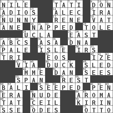 ACROSS 1. Mediterranean tributary 5. Jacques of French films 9. Spanish title 12. Goodbye (Sp.) 14. Actor Baldwin 15. Retirement account (abbr.) 16. Pet term 17. French philosopher Descartes 18. Large container 19. One (Scot) 20. Slept 23. Lacquered or enameled metalware 24. Southern CA. univ. 25. Compass direction 27. Lettered men learn these first 30. White ___ sheet 32. Heredity factor (abbr.) 33. Light colored 34. Small island 36. Big collection agency 38. Three (prefix) 39. Greek goddess of the dawn 40. Ending with capital 43. By way of 46. Evade 48. Downhill vehicle 49. Madame (abbr.) 51. One of the 12 tribes of Israel 52. Observes 53. Connect, as a bridge 54. State of inaction 56. Indonesian resort city 58. Oozed 61. Writing instrument 64. Period 65. Unadorned 66. Odor 68. Make lace 69. To provide with a ceiling 70. Japanese brewing company 71. Compass dir. 72. Lyric poems 73. Von Bismarck DOWN 1. Nanny 2. Goddess of spring and wife of Bragi 3. Actor's bit 4. Period of immesurable duration 5. Canvas cover 6. Toward shelter 7. Watched over 8. Frozen water 9. A piece of turf (Scot.) 10. Of the mouth 11. Nathan's nickname 13. Synchronize (abbr.) 21. Jai _ 22. Went by 23. Russian ruler of old 24. Purpose 26. Black tropical American cuckoo 27. Fitting 28. Drinking establishment 29. 154 in Roman numerals 31. Verbally 35. Fortification 37. Filth; sediment 41. Last letter of the English alphabet 42. Begley and Asner 44. Body of Kaffir warriors 45. Wet nurse (var.) 47. Leg joint 48. Fast jet (abbr.) 50. Followed as a consequence or result 53. Chalkboard 55. Neighbor of Neb. 56. Antes 57. Ancient river in northeast Turkey 59. Singer Brickell 60. Snakelike fish 61. Left side of a ship or aircraft 62. Send forth 63. Billionth: prefix 65. Non-commissioned officer (abbr.) 67. _ de Janeiro
