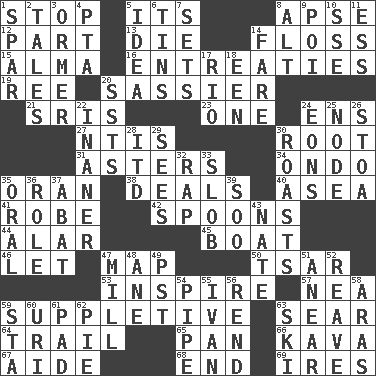 ACROSS 1. Discontinue 5. It is 8. Domed church section 12. Component 13. Pass on 14. Soft thread for cleaning between teeth 15. _ mater 16. Pleas 19. To sift 20. More impudent 21. Indian titles of respect 23. Single 24. Followers of ems 27. Nuclear Threat Initiatives 30. Carrot, for example 31. Michaelmas daisies 34. Southwest Nigerian state 35. Northwest Algerian city 38. Allots cards 40. Toward the sea 41. Loose flowing garment 42. Soup utensils 44. Having or resembling wings 45. Water vessel 46. Allow 47. Atlas unit 50. Russian ruler of old 53. Stimulate to action 57. Teachers' org. 59. Supplying deficiencies 63. Shrivel 64. Drop behind 65. Baking dish 66. Polynesian shrub of the pepper family 67. Assistant 68. Conclusion 69. Angers DOWN 1. Practice fight 2. Falsehoods 3. Abalone 4. Parent Teacher Assoc. 5. It may be bright or harebrained 6. Metal containers 7. Puts into a specified state 8. The first octave above the treble staff 9. Luau course 10. Compass dir. 11. Double-curved letter 14. Conductor's collection 17. _ de Janeiro 18. Car or cant ending 20. Fast planes 22. Sillier 24. Immeasurably long periods of time 25. Connecting point 26. Portico 28. It would 29. Observes 30. Cooks with dry heat, as in an oven 32. Strike 33. Messy guy 35. Of the mouth 36. Hero or heavy, e.g. 37. Blind as ____ 39. "Barney Miller" actor Jack 43. Nathan's nickname 47. Place where flour is made 48. One (Scot) 49. Pacific Standard Time (abbr.) 51. Approach 52. Rob, plunder, or pillage 54. Corncob 55. "Terrible" tsar 56. Tear apart 58. Ancient river in northeast Turkey 59. R.R. building 60. RI univ. 61. Writing tablet 62. Sliced dessert 63. What Jean-Claude Killy likes to do