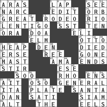 ACROSS 1. Caspian sea tributary 5. Pet locale 8. Observe 11. Drug cop 12. Prepare for publication 14. Globe 15. Relatively large 17. Cowboy competition 18. _ de Janeiro 19. Small, flat, pigmented spot on the skin 21. Fast jet (abbr.) 22. "___ Little Indians" 23. Mouth or opening 24. ___ good deed 25. Connecticut Ivy Leaguer 27. Shade tree 28. Von Bismarck 31. Pile 35. Lair 37. Passed on 38. Celtic language 39. To sift 41. Went 42. Vertical spar for supporting sails 43. Nanny (var.) 45. Conclusions 46. Commotion 47. Compass dir. 49. "Barney Miller" actor Jack 51. 17th letter of the Greek alphabet 52. Followers of ems 55. Small island 57. Bear (Spanish) 60. Commissioned military rank 62. Call ___ day 63. Food holder 65. Before Barbara or Clara 66. Daniel's nick name 67. Suttee (variant) 68. Thailand, formerly 69. The first octave above the treble staff 70. Definite Article 71. Snakelike fish DOWN 1. White American of non-Hispanic descent 2. Less widely known 3. Sports stadium 4. Scram, to a cat 5. Lion 6. Does sums 7. Sliced desserts 8. Making a chance decision by using lots 9. 4th largest of the Great Lakes 10. Inky black, to poets 13. Lug 16. Periodic rise and fall of the sea level 17. Nomad 20. Precious metal 26. Cabin 29. Watch over 30. Lyric poems 31. Equivocates 32. Part of Q.E.F. 33. Helper 34. Stone: prefix 36. Teachers' org. 40. Develop 44. American tennis player Robert 48. Immeasurably long periods of time 50. I made a mistake 52. Bert's buddy 53. Brizilian seaport 54. Shuts with force 55. Opera by Verdi 56. Slanted text style (abbr.) 58. Narrow board 59. Pledge 61. Comfort 64. Neckwear