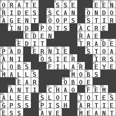 ACROSS 1. Declaim 6. Compass dir. 9. Car or cant ending 12. Amusement-park features 13. Glance over 14. Southwest Nigerian state 15. Representative 16. I made a mistake 17. Use a swizzle stick 18. Indiana (abbr.) 19. Cooking vessels 20. 1/640 square mile 21. Locale of original sin 23. Actress Charlotte 24. Prepare for publication 25. Buy and sell 28. Groovy apt. 30. Bert's buddy 34. Portico 35. Black tropical American cuckoo 36. Flexible twig of a willow tree 38. Big collection agency 39. Tennis shots 41. Of or pertaining to a thread or threads 43. Sight organ 44. Shopping centers 46. Crowds into 48. Ewer handle 49. Mitch Miller's instrument 50. Against 51. US Secretary of Labor Elaine L. _ 53. Opposite of masc. 56. Toward shelter 57. Narrow opening 58. Hauls 60. Global Positioning Systems (abbr.) 61. Expression of disdain 62. Nick name for Arthur 63. Curvy letter 64. "___ Maria" 65. Intended DOWN 1. Mouth or opening 2. Swiss mountan, "Queen of the Mountains" 3. An important port of Yemen 4. Watched over 5. Eastern Standard Time (abbr.) 6. Highlander 7. Plant excrements 8. Followers of ems 9. Pleas 10. Singer Brickell 11. And not 13. Within a short period 14. Motion picture awards 19. Stone: prefix 20. Nonscientific branch of learning 22. Expire 24. The property of being fit to eat 26. Dinghy 27. Relaxation 28. Inside of hand 29. Small Philippine buffalo 31. Overdraft (abbr.) 32. One more than two 33. Snakelike fish 37. Role for Stallone 40. Chalkboards 42. Friend of Pooh 45. _ Lanka 47. Prior to 49. Pledge 50. High mountains 51. 154 in Roman numerals 52. Stockings 54. Singer James 55. Count _ (2 wds.) 56. Grow older 57. Health resort 58. Scottish cap 59. Arrange properly for use