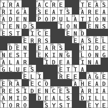 ACROSS 1. Retirement account (abbr.) 4. Measure of real estate 8. Afternoon social gatherings 12. Port city in Latvia 14. Theater features 16. Type of rug 17. An important port of Yemen 18. Census information 20. Watches over 22. Electrically charged atom 23. Followers of ems 24. Eastern Standard Time (abbr.) 25. Frozen water 28. Conclude 30. Blunders 31. Artist's stand 35. Lair 37. Hearing organs 40. Flintstone garb 41. A home for chicks 42. Supplementing with great effort 44. Protracted 45. Having or resembling wings 46. It may be bright or harebrained 47. _ tizzy (2 wds.) 48. Cements 50. Singer James 52. Connecticut Ivy Leaguer 54. To sift 55. Mature 58. Period 61. Environmental prefix 63. Toward the future 65. Homes 70. Operatic vocal solo 71. Among 72. Allots cards 73. Deli pickle 74. "Corrida" creature 75. System (abbr.) 76. Sight organ DOWN 1. Feeling or showing extreme anger 2. Amusement-park features 3. Representative 4. Cleo's killer 5. Corporate head (abbr.) 6. Hit sharply and swiftly 7. Needle holder 8. Make lace 9. One of the Great Lakes 10. Period of immesurable duration 11. Without 13. Added to 15. A type of plum 19. Singer Murray 21. Title for a knight 26. Algonquian 27. 1973 Nobel Price Winner (Physics) Leo 29. Mexican or Central American flower 30. Main course 32. The Jewish people; Israel 33. Pulitzer Prize-winning author Ferber 34. Part of a journey 35. Small valley 36. He sold his birthright 38. To free from 39. Contemptuous expression 41. Tired old horse 43. Yard entry 49. Downhill vehicle 51. Afternoon social gathering 53. On the rocks 55. Nest on high 56. Lightheartedly 57. Peak District village in England 58. Part of Q.E.F. 59. San ____ (Riviera town) 60. SW Saudi Arabia district 62. Singles 64. Possessed 66. Wedding promise 67. Island 68. Raised railways 69. Fast jet (abbr.)