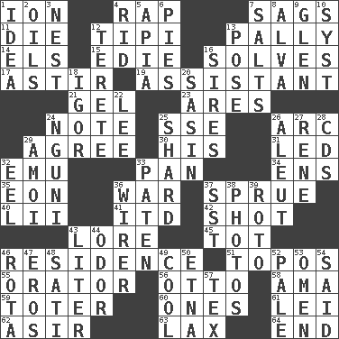 ACROSS 1. Electrically charged atom 4. Reproach for some lapse or misdeed 7. Droops 11. Expire 12. Native american tent (variation) 13. Friendly 14. Raised railways 15. Singer Brickell 16. Finds the solution 17. Moving about 19. Aide 21. Set 23. Ancient Greek god of war 24. Brief written record 25. Compass dir. 26. Curve 29. Match 30. Part of HMS, perhaps 31. Directed 32. Australian flightless bird 33. Baking dish 34. Followers of ems 35. Period of immesurable duration 36. Armed conflict 37. Disorder 40. Cards in a Roman deck? 41. It would 42. Went for two points 43. Old wives' tales, e.g. 45. Small child 46. Home 51. Literary convention 55. Speaker 56. "Beetle Bailey" pooch 58. Nanny (var.) 59. Carrier 60. Washington bills 61. Flowery wreath 62. SW Saudi Arabia district 63. Not strict 64. Conclusion DOWN 1. The main thing one is thinking about 2. Lubricates 3. Egg locale 4. To free from 5. Capital of Western Samoa 6. Sliced desserts 7. Table seasonings 8. Inventor's middle name 9. Small, secluded valley 10. System (abbr.) 12. Cigar-shaped 13. Airs 16. Begets 18. Composer Stravinsky 20. Indian antelope 22. Area sheltered from the wind 24. Group of southern Bantu languages 25. Broken piece 26. Native American of Southwest Alaska 27. French philosopher Descartes 28. Music discs 29. Mine, in Marseilles 32. Snakelike fish 33. Eucharist need 36. One who wires 37. Fast jet (abbr.) 38. Pictures 39. Printing process, for short 43. 61 cubic inches 44. Scent 46. Roll call or roster of names 47. Greek god of love 48. Suttee (variant) 49. Calm and collected 50. Inactive volcano in Sicily 52. Light colored 53. Sign of things to come 54. Expressed in words 57. John Ritter's dad