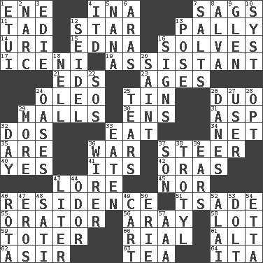 ACROSS 1. Compass dir. 4. _ tizzy (2 wds.) 7. Droops 11. Small boy 12. Play the lead 13. Chummy 14. RI univ. 15. Pulitzer Prize-winning author Ferber 16. Finds the solution 17. Ancient Celtic tribe of eastern Britain 19. Aide 21. Begley and Asner 23. Eras 24. Butter sub 25. Shallow baking pan 26. Superhero pair 29. Promenades 30. Followers of ems 31. Cleo's killer 32. Two (Sp.) 33. Ingest 34. Fish or hair follower 35. "We ___ not amused" (Victoria) 36. Armed conflict 37. Bull 40. Consenting reply 41. It is 42. Mouths or openings 43. Old wives' tales, e.g. 45. Not either 46. Home 51. Sadhe (variant) 55. Speaker 56. Like ___ of sunshine 58. Car dealer's back yard 59. Carrier 60. Monetary unit of Yemen 61. Keyboard modifier key 62. SW Saudi Arabia district 63. Beverage made from leaves 64. Call ___ day DOWN 1. Needle case 2. Drug cop 3. Singer Brickell 4. It would 5. Grandmother 6. Ancient river in northeast Turkey 7. Table seasonings 8. Inventor's middle name 9. Small, secluded valley 10. System (abbr.) 12. A glass for beer 13. Introduce or present, as a question 16. Attaches a signature 18. 1994 drama film starring Jodie Foster 20. Inhabitant of Heaven 22. Mayday 24. Fertile tracts in a desert 25. Separates forcefully 26. Natives or inhabitants of Denmark 27. One who uses or employs something 28. Elect 29. Greater amount 32. 24 hours 33. Consumed 36. One who wires 37. Male child 38. Trinitrotoluene 39. Hearing organs 43. 61 cubic inches 44. Scent 46. Roll call or roster of names 47. Greek god of love 48. Suttee (variant) 49. Draw slowly or heavily 50. One of the Great Lakes 52. Jai ____ 53. Dunce 54. Singer James 57. American Automobile Association (abbr.)