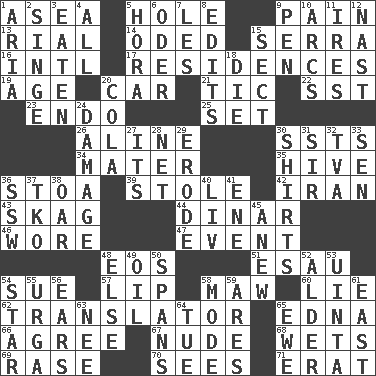 ACROSS 1. Toward the sea 5. Hollow 9. Ache 13. Monetary unit of Yemen 14. Wrote a lyric poem 15. Spanish missionary in California 16. International (abbr.) 17. Dwellings 19. Ripen 20. 4-wheeled motor vehicle 21. Nervous spasm 22. Fast jet (abbr.) 23. Inside; within (prefix) 25. Arrange properly for use 26. Place in a line 30. Fast planes 34. Mother 35. Hub of activity 36. Portico 39. Fur scarf 42. SW Asia republic 43. Heroin 44. Middle Eastern gold or silver currency 46. Had on 47. Happening 48. Greek goddess of the dawn 51. He sold his birthright 54. Take to court 57. Mouth edge 58. Informal term for the mouth 60. Whopper 62. Interpreter 65. Pulitzer Prize-winning author Ferber 66. Match 67. Naked 68. Moistens 69. To erase 70. Observes 71. Part of Q.E.F. DOWN 1. Operatic vocal solo 2. Scorch 3. Ingested 4. Everything 5. Israeli folk dance 6. Baltic tributary 7. French article 8. Proofreads 9. Animal enclosure 10. Curves 11. Angers 12. Political cartoonist Thomas 15. Religious group 18. Expire 20. Root beer relative 24. Break 27. ___ a Wonderful Life 28. Fish or hair follower 29. Wear away 30. Upper-body garments 31. Title for a knight 32. Federal power corp. 33. Elected rep. 36. Compass dir. 37. Ring climax 38. Boat paddle 40. 54 in ancient Rome 41. Compass dir. 45. Afresh 48. Otherwise 49. Lubricate 50. Connects, as a bridge 52. Tree or shrub in the Birch family 53. National forest in Provo, Utah 54. Play the lead 55. Capital and largest city of Mongolia 56. Hearing organs 58. Method 59. Ancient Greek god of war 61. Compass direction 63. Born 64. Third day of the wk. 65. She-sheep