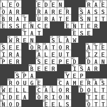 ACROSS 1. Lion 4. Locale of original sin 8. Actress Charlotte 11. Boat paddle 12. More valued for its uncommonness 14. Backtalk 15. Naughty child 17. A salt of uric acid 18. In a ____ (agitated or irritated) 19. Core 21. Keyboard key 23. Make lace 24. Compass dir. 25. Songbird 27. Cole _ (cabbage dish) 30. Perceive with the eye 31. Speaker 34. Had dinner 37. Retirement account (abbr.) 38. Native American of Southwest Alaska 39. Ending with capital 40. For each 41. Oozed 43. One of the 12 tribes of Israel 44. Fermented drink made from hops 45. Austrian river, tributary to the Danube 47. Health resort 49. Slangy assent 50. Makeup applied to the cheeks 52. Devices for capturing images 56. Not ill 57. Bodily heat indicating an inflammation 60. Dunce 61. The content of cognition 62. Greek mythologigal hunter 63. Make a knot 64. Lower and raise head in agreement 65. Snakelike fish 66. Baseball player Mel DOWN 1. Ear part 2. Hearing organs 3. Mouths or openings 4. Spew [out] 5. Have the gumption 6. Period 7. Fish or hair follower 8. The wife of a rajah (variant) 9. SW Saudi Arabia district 10. Eastern Standard Time (abbr.) 13. To sift 14. Fast planes 16. Wig 20. Billionth: prefix 22. ___ Haven, CT 25. We are 26. Bring up, as a child 27. Navigate 28. Central Nebraska county 29. Johnson of "Laugh-In" 30. Small drink 32. Raze (variant) 33. Toward shelter 34. Opera by Verdi 35. Czar 36. Car or cant ending 42. South Vietnam president (1954) 44. Paper or plastic container 46. Drove too fast 47. Having a sole or soles 48. Monetary unit of Botswana 49. Entertaining tales 50. Redecorate 51. Environmental prefix 52. Calm and collected 53. Printing process, for short 54. Set down 55. Proofreading order 56. Acquire through effort 58. "We ___ not amused" (Victoria) 59. Whopper