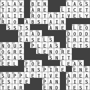 ACROSS 1. Cole _ (cabbage dish) 5. Benjamin's nick name 8. Straggles 12. Periodic rise and fall of the sea level 13. "We ___ not amused" (Victoria) 14. It is permitted: Lat. 15. Came down and settled, as after flight 16. Happening in regular succession 19. River (Sp.) 20. Refrain by choice 21. Fast planes 23. A saturated hydrocarbon 24. Lion 27. Froth on beer 30. Texas town _ City 31. Artist's stands 34. One of the Great Lakes 35. Common sense 38. Entreaties 40. Allows 41. Legendary monster 42. Poe poem 44. Oceans 45. In a ____ (agitated or irritated) 46. Snakelike fish 47. Enemy 50. Path through which fluid escapes 53. Stimulate to action 57. Compass dir. 59. Supplementary 63. Type of rug 64. First name in cosmetics 65. Baking dish 66. Sliced desserts 67. Pull into pieces 68. Conclusion 69. Trial DOWN 1. Play the lead 2. Ms. Damita and namesakes 3. Goodbye (Sp.) 4. Dripping 5. Sharp remark 6. Greek god of love 7. Remaining after all deductions 8. 54 in ancient Rome 9. Adept person 10. Set 11. Filthy place 14. Actor's bit 17. American Automobile Association (abbr.) 18. Shallow baking pan 20. Toward the sea 22. College papers 24. Old wives' tales, e.g. 25. Prepare for publication 26. Lyric poems 28. Viper 29. Small valley 30. Keyboard key 32. Area sheltered from the wind 33. Without 35. Characteristic smell of wine 36. Double curve, resembling the letter S 37. Mountain range 39. Male offspring 43. Cause heat under the collar 47. Do some clerical work 48. Single 49. Eastern Standard Time (abbr.) 51. Nest on high 52. Leg joints 54. Corncob 55. "Terrible" tsar 56. Tear apart 58. 90 degrees 59. Put into a specified state 60. Purpose 61. Parent Teacher Association (abbr.) 62. For each 63. Fitting