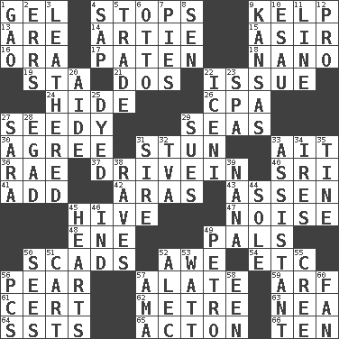 ACROSS 1. Set 4. Closes up, plugs up 9. Seaweed 13. "We ___ not amused" (Victoria) 14. Nick name for Arthur 15. SW Saudi Arabia district 16. Mouth or opening 17. Eucharist need 18. Billionth: prefix 19. R.R. building 21. Two (Sp.) 22. Come out of 24. Flintstone garb 26. Tax preparer (abbr.) 27. Shabby and untidy 29. Oceans 30. Match 31. Surprise greatly 33. Small island 36. Actress Charlotte 37. Popular '50s hangout 40. _ Lanka 41. Say or write further 42. Caspian sea tributary 43. NE Netherlands city 45. Hub of activity 47. Annoying sound 48. Compass dir. 49. Friends 50. Tons 52. Deep reverence 54. And so on (abbr.) 56. Lightbulb-shaped fruit 57. Having winglike extensions 59. Sandy's bark 61. An absolute certainty 62. Distance measurement (Brit.) 63. Teachers' org. 64. Fast planes 65. NE Massachussets city 66. "___ Little Indians" DOWN 1. E Mali city 2. Blunders 3. Tough but pliablecoriaceous 4. Plant excrement 5. Buy and sell 6. "Beetle Bailey" pooch 7. Sliced desserts 8. Elected rep. 9. Sunflower state 10. He sold his birthright 11. Actor's bit 12. Adept person 20. Assistant 22. Ancient Celtic tribe of eastern Britain 23. Health resort 25. Colored 27. "Two Mules for Sister ____" 28. Mild oath 29. Takes to court 31. The founder of a family 32. Federal power corp. 33. Aide 34. Angers 35. Prong on a fork 38. All-night dance parties 39. Nanny 44. Flatfish 45. Centers of feelings and intuitions 46. Working for oneself (abbr.) 49. Stone: prefix 50. Perceives with the eye 51. Heavy open wagon 52. Actor Baldwin 53. Electrical Unit 55. Algonquian 56. Personal Computers (abbr.) 57. Nursemaid (var.) 58. Car or cant ending 60. Air blower