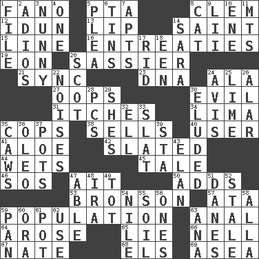 ACROSS 1. Papal veil 5. Parent Teacher Assoc. 8. To starve (Brit.) 12. Goddess of spring and wife of Bragi 13. Mouth edge 14. Virtuous person 15. Actor's bit 16. Pleas 19. A really long time 20. More lively and spirited 21. Synchronize (abbr.) 23. Heredity factor (abbr.) 24. Chicken ___ king 27. I made a mistake 30. Morally bad or wrong 31. Skin irritations 34. Pale green bean 35. 911 reaches them 38. Exchanges for money 40. One who uses or employs something 41. Medicinal plant 42. Scheduled 44. Moistens 45. Lie 46. Mayday 47. Small island 50. Does sums 53. "Death Wish" actor 57. "One Day ___ Time" 59. Census information 63. Of or related to the anus 64. Came up 65. Whopper 66. 1994 drama film starring Jodie Foster 67. Nathan's nickname 68. Raised railways 69. At sea DOWN 1. Do some clerical work 2. Goodbye (Sp.) 3. Pet term 4. Single 5. Entreaty 6. Metal containers 7. Tenement units (abbr.) 8. Feline 9. Cards in a Roman deck? 10. Compass dir. 11. Mountains (abbr.) 14. "Two Mules for Sister ____" 17. To free from 18. Car or cant ending 20. Native of Scotland 22. Annoying sounds 24. Advice 25. Welles in "The Third Man" 26. Having or resembling wings 28. Personal Computers (abbr.) 29. "______ My Girl" (Turtles hit) 30. Evaded 32. Pipe bend 33. Narrow board 35. Crow sounds 36. Butter sub 37. Cooking vessels 39. R.R. building 43. Style 47. Competent 48. Lyricist Gershwin 49. Small child 51. Natives or inhabitants of Denmark 52. Having lost freshness 54. Mediterranean tributary 55. Earth 56. Singles 58. Silent film actress Nazimova 59. Baking dish 60. Mouth or opening 61. Cooking vessel 62. Purpose 63. Santa ___, CA