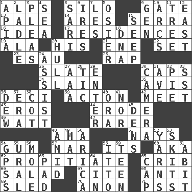 ACROSS 1. High mountains 5. Grain storage tower 9. Yard entry 13. Diluted with white 14. Ancient Greek god of war 15. Father Junipero _ 16. The content of cognition 17. Dwellings 19. According to 20. Part of HMS, perhaps 21. Compass dir. 22. Arrange properly for use 23. He sold his birthright 25. Hit sharply and swiftly 26. Schedule 30. Balmoral and tarboosh 34. Killed 35. Deliberation 36. Tenth: prefix 39. NE Massachussets city 42. Rendezvous 43. Greek god of love 44. Eat (away) 46. Electrical Unit 47. Less widely known 48. Nursemaid (var.) 51. Negative votes 54. Chewing product 57. Spoil 58. It is 60. Alias (abbr.) 62. Appease 65. Baby bed with high sides 66. First course 67. Quote 68. Opposed to 69. Downhill vehicle 70. At once, immediately (arch.) 71. Inconspicuous attention getter DOWN 1. Capital of Western Samoa 2. Dipping utensil 3. Entreaties 4. Ocean 5. Indian skirt 6. Angers 7. French article 8. Flexible twig of a willow tree 9. Commissioned military rank (abbr.) 10. Curves 11. Woody plant 12. Compass direction 15. Ooze 18. Heredity factor (abbr.) 20. Frame or body of a ship 24. Help 27. Auto club (abbr.) 28. Nervous spasm 29. Keyboard key 30. Device for capturing images 31. "___ Maria" 32. Sliced dessert 33. Fast jet (abbr.) 36. Morning condensation 37. Period 38. Small bed 40. Mouth or opening 41. And not 45. Hiding places for outlaws 48. Among 49. Floor covering 50. N. Chile seaport 52. Entertaining tales 53. Burlesque acts 54. Global Positioning Systems (abbr.) 55. Mountain range 56. Undercover agent 58. "Tell ____ the Marines!" 59. Adolescent 61. "This won't hurt ____!" 63. Writing tablet 64. The 18th letter of the Arabic alphabet 65. Head covering