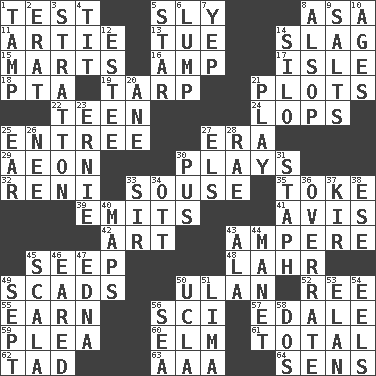 ACROSS 1. Trial 5. Secret 8. White ___ sheet 11. Nick name for Arthur 13. Third day of the wk. 14. Volcanic refuse 15. Shops 16. Electrical Unit 17. Small island 18. Parent Teacher Association (abbr.) 19. Canvas cover 21. Graphs 22. Adolescent 24. Chops off 25. Main course 27. Epoch 29. A really long time 30. Romps 32. Painter Guido (1575-1642) 33. Boozer 35. Casino tip 39. Sends forth 41. Opinion 42. Nonscientific branch of learning 43. Electrical Unit 45. Ooze 48. Cowardly lion portrayer 49. Heaps 50. ____ Bator 52. To riddle 55. Merit 56. _-fi 57. Peak District village in England 59. Entreaty 60. Shade tree 61. Add up to 62. Small amount or degree 63. American Automobile Association (abbr.) 64. Elected reps. DOWN 1. Pack (down) 2. Part of Q.E.F. 3. Ski resort town in Vermont 4. Teat (slang) 5. Play the lead 6. Mass 7. Slangy assent 8. Columnist Joseph or Stewart 9. Table seasonings 10. Grows older 12. First name in cosmetics 14. Grain storage tower 20. A saturated hydrocarbon 21. Live dramatic performance 23. Bert's buddy 25. Ewer handle 26. Born 27. Raised railways 28. Actress Charlotte 30. Ichor 31. Staphylococcus 33. Title for a knight 34. Baseball player Mel 36. Make much ado about nothing 37. Apertif with cassis 38. Compass dir. 40. Atlas contents 43. In the manner of 44. French painter Edouard 45. Any of the three canals of the cochlea 46. Having ears or earlike features 47. Pulitzer Prize-winning author Ferber 49. Back-to-school mo. 50. Southern CA. univ. 51. Pale green bean 53. Style 54. Snakelike fish 56. Ocean 58. Two (Sp.)