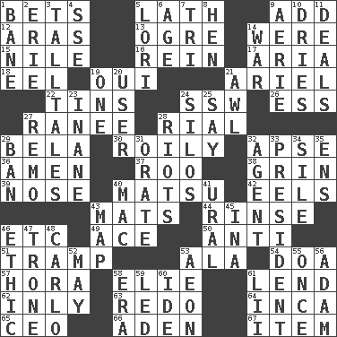 ACROSS 1. Wagers 5. Thin strip of wood or metal 9. Increase 12. Ancient river in northeast Turkey 13. Legendary monster 14. Past tense of be (plural) 15. "Death on the ____" 16. It's straight from the horse's mouth 17. Roberta Peters solo 18. Snakelike fish 19. Fr. "Yes" 21. Satellite of Uranus 22. Airtight sealed metal containers 24. Compass dir. 26. Curvy letter 27. The wife of a rajah (variant) 28. Monetary unit of Yemen 29. Actor Lugosi 30. Turbulent 32. Domed church section 36. So be it 37. Friend of Pooh 38. Broad smile 39. Olfactory organ 40. Taiwanese island in East China Sea 42. Snakelike fish 43. Floor coverings 44. Remove soap 46. And so on (abbr.) 49. Adept person 50. Opposed to 51. _____ steamer (cargo ship) 53. According to 54. ___ good deed 57. Israeli folk dance 58. Writer Wiesel 61. Grant temporary use of 62. In an inward manner 63. Make new 64. South American Indian 65. Corporate head (abbr.) 66. Arabian gulf 67. Detail DOWN 1. Object of repulsion 2. One of the Great Lakes 3. Baron Munchausen's specialties 4. Compass dir. 5. Australian parrot (variant) 6. Personal question 7. Three (prefix) 8. Layer 9. Nest on high 10. Frees from moisture 11. Allots cards 14. Armed conflict 19. Single 20. One who uses or employs something 21. Leather borer 23. Lacking in sense or substance 24. Grain storage towers 25. Declare 27. San ____ (Riviera town) 28. Debaucheries 29. Forbid 31. Speak pompously 32. Representative 33. Elected leader of a country 34. Drop; flow; fall 35. Followers of ems 40. Apple computer (short form) 41. Mountain range 43. Atlas unit 45. _ tizzy (2 wds.) 46. Principle of right and wrong 47. Heavy duty weighing machine 48. Monte _, Las Vegas Hotel/Casino 52. Fifth month 53. A really long time 55. Single time 56. First of billions? 58. Period 59. Directed 60. Binary compound 61. Cards in a Roman deck?
