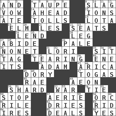 ACROSS 1. Added to 4. Grayish beige 9. Volcanic refuse 13. Promise 14. Forward in time 15. Charged particles 16. Had dinner 17. For Whom the Bell _____ 18. Globular water bottle used in Asia 19. Shade tree 21. French article 22. Theater features 24. Grant temporary use of 26. Part of a journey 27. Tolerate 29. Light colored 30. Music written for nine 31. Australian parrot (variant) 33. Be seated 36. Label 37. Lacerating 40. Compass dir. 41. ___ a Wonderful Life 42. First of billions? 43. N. Chile seaport 45. Small, narrow, flatbottom fishing boat 47. Ancient Roman robes 48. Actress Charlotte 49. Period of immesurable duration 50. Broken piece 52. Armed conflict 54. Make a knot 56. Halt 57. Nest on high 59. The grampus (Milton) 61. Cause heat under the collar 62. Frees from moisture 63. To free from 64. Angers 65. Allots cards 66. Consenting reply DOWN 1. Actress Gardner 2. Musical sound 3. Homes 4. Make lace 5. Hold, grip (Informal) 6. Ubangi River tributary 7. Friends 8. Begley and Asner 9. Fodder prepared in a silo 10. Spoils 11. Pismires 12. Girls' org. (abbr.) 20. Ancient Persian 22. Killed 23. Snakelike fish 25. Remaining after all deductions 27. Against 28. Water vessel 29. Demure 31. Kenny Rogers chart-topper in '80 32. Mouth or opening 33. Signiory (variant) 34. South American Indian 35. Afternoon social gatherings 38. Having ears or earlike features 39. Yard entry 44. Carrot, for example 45. Window treatments 46. Rowing implement 49. Satellite of Uranus 50. Disorderly outburst 51. Hollow 52. We are 53. Operatic vocal solo 55. 4th largest of the Great Lakes 56. Indian title of respect (Mr.) 57. Say or write further 58. Double-curved letter 60. Music discs