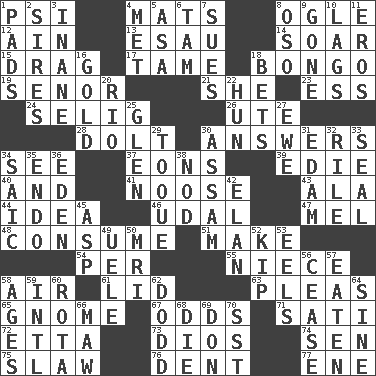 ACROSS 1. Air pressure measure (abbr.) 4. Floor coverings 8. Stare at amorously 12. The 18th letter of the Arabic alphabet 13. He sold his birthright 14. Fly high 15. To draw with force 17. Docile 18. Beat drum 19. Sir (Sp.) 21. A female animal or person 23. Curvy letter 24. Major League Baseball Commissioner Bud 26. Shoshoni 28. Dunce 30. Statements in reply to questions 34. Perceive with the eye 37. Immeasurably long periods of time 39. Singer Brickell 40. Plus 41. Trap for birds or small mammals 43. According to 44. The main thing one is thinking about 46. Hereditary estate 47. Cartoonist voice _ Blanc 48. Ingest 51. Cause to be 54. For each 55. Sibling's daughter 58. Wind 61. Flaplike covering 63. Entreaties 65. Dwarf 67. Probability 71. Suttee (variant) 72. Singer James 73. "Vaya con ____" 74. Elected rep. 75. Cole _ (cabbage dish) 76. Incision 77. Compass dir. DOWN 1. Writing tablets 2. Begets 3. Empty; void 4. Was introduced to 5. White ___ sheet 6. Scottish cap 7. Institutes legal proceedings 8. Bear (Spanish) 9. Went 10. Falls behind 11. Greek god of love 16. Precious metal 18. Stakes 20. River (Sp.) 22. Attila the _ 25. Small, secluded valley 27. She-sheep 29. Woman's close-fitting hat 30. Indian state 31. Dutch treat 32. Cause heat under the collar 33. Lick closed 34. Ketch in the Levant 35. Inside; within (prefix) 36. Paradise 38. Dreamland 42. Liveliness 45. Viper 49. Ubangi River tributary 50. Medical imaging device (abbr.) 52. Monetary unit of Laos 53. Snakelike fish 56. Stop 57. Eroded 58. Grows older 59. International (abbr.) 60. Roll call or roster of names 62. Texas town _ City 64. Trig term 66. Opening into something insatiable 68. Expire 69. Spanish title 70. Fast jet (abbr.)