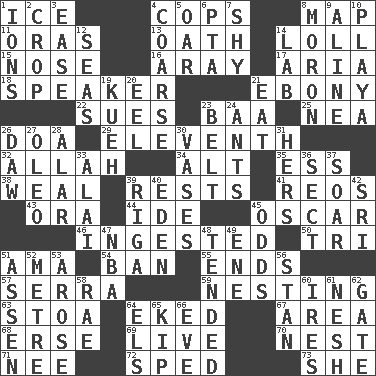 ACROSS 1. Frozen water 4. 911 reaches them 8. Atlas unit 11. Mouths or openings 13. Pledge 14. Hang loosely or laxly 15. Sense of smell 16. Like ___ of sunshine 17. Operatic vocal solo 18. Orator 21. Dark wood 22. Takes to court 23. Sound made by sheep 25. Teachers' org. 26. ___ good deed 29. Veterans Day date 32. Assad's deity 34. Keyboard modifier key 35. Curvy letter 38. Welt 39. Musical pauses 41. Vintage cars 43. Mouth or opening 44. Binary compound 45. Motion picture award 46. Eaten 50. Three (prefix) 51. Nanny (var.) 54. Prohibit 55. Conclusions 57. Father Junipero _ 59. Snuggling 63. Portico 64. Supplemented with great effort 67. Type of rug 68. Celtic language 69. Moving, as bait 70. A home for chicks 71. Born 72. Broke a traffic law 73. A female animal or person DOWN 1. Charged atoms 2. Riding implement 3. Relaxation 4. Unrefined 5. Boat paddle 6. Parent Teacher Assoc. 7. Like a shrinking violet 8. Person of subnormal intelligence 9. Place in a line 10. Beach, in Buenos Aires 12. Oceans 14. Experiment locale 19. Malaysian steamed pastry 20. Snakelike fish 21. Consume 23. Waist strap 24. Pismires 26. Simpleton 27. Margarine 28. Having or resembling wings 30. Flower holders 31. Possessive pronoun 33. Jai _ 36. Religious group 37. Fly high 39. Port city in Latvia 40. Locale of original sin 42. _ Lanka 45. Likelihood 47. Basketball assoc. 48. Looked after 49. Compass dir. 51. NE Netherlands city 52. Distance measurement (Brit.) 53. Came up 56. Comedian Laurel of Laurel & Hardy 58. Actress Charlotte 60. Angers 61. Delicate 62. Yard entry 64. Raised railways 65. Monetary unit of Laos 66. First lady