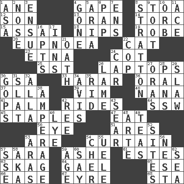 ACROSS 1. One (Scot) 4. Open wide 8. Portico 12. Manchild 13. Northwest Algerian city 14. Torque (variant) 15. Slender Brazilian palm 18. Pinches, bites 19. Loose flowing garment 20. Normal relaxed breathing 22. Domesticated feline 23. Inactive volcano in Sicily 24. Small bed 25. Fast jet (abbr.) 26. Portable computers 30. Girls' org. (abbr.) 33. Ethiopian city, capital of Harari 36. Spoken 37. Rounded earthenware pot or jar 39. Zeal 40. Grandmother 41. Inside of hand 42. Amusement-park features 44. Compass dir. 45. Paper fasteners 47. Ingest 50. Sight organ 51. Ancient Greek god of war 53. "We ___ not amused" (Victoria) 54. Window treatment 57. "Two Mules for Sister ____" 59. American tennis player Robert 61. _____ Park, CO 63. Heroin 64. Highlander 65. Compass dir. 66. Relaxation 67. Jane of fiction 68. R.R. building DOWN 1. White ___ sheet 2. Characteristic smell of wine 3. Take place subsequently 4. Went 5. Operatic vocal solo 6. Infant food 7. Followers of ems 8. Ski resort town in Vermont 9. A blast of a horn 10. Globe 11. Adept person 16. Tenement units (abbr.) 17. Restaurants 21. Pledge 22. Police officer (slang) 24. 4-wheeled motor vehicle 26. Unable to walk 27. Mouths or openings 28. Baking dishes 29. Cole _ (cabbage dish) 30. Republicans 31. Narrow board 32. Silent film actress Nazimova 34. Opinion 35. To free from 38. Electrical Measurement 42. To separate or throw off 43. Burn superficially 46. Potassium hydroxide 48. Johnson of "Laugh-In" 49. Beverages made from leaves 52. Settings 53. Ancient river in northeast Turkey 54. "Mermaids" star 55. Ubangi River tributary 56. A home for chicks 57. Compass dir. 58. Alias (abbr.) 59. Ripen 60. Declare 62. Ocean
