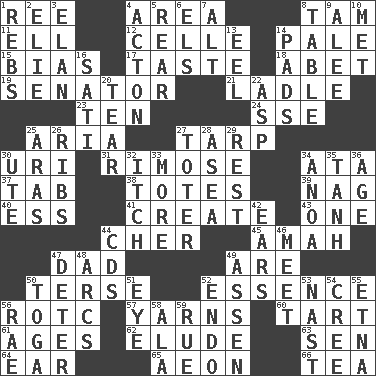 ACROSS 1. To sift 4. Length times width 8. Scottish cap 11. Pipe bend 12. Cell (Danish) 14. Light colored 15. Prejudice 17. Clothes sense 18. Collude with 19. Legislator 21. Dipping utensil 23. "___ Little Indians" 24. Compass dir. 25. Roberta Peters solo 27. Canvas cover 30. RI univ. 31. Full of chinks, cracks, or crevices 34. "One Day ___ Time" 37. Keyboard key 38. Hauls 39. Tired old horse 40. Double-curved letter 41. Cause to be 43. Single 44. "Mermaids" star 45. Nanny 47. June honoree 49. "We ___ not amused" (Victoria) 50. Laconic 52. Gist 56. College mil. group 57. Entertaining tales 60. Small pie 61. Grows older 62. Evade 63. Elected rep. 64. Hearing organ 65. Period of immesurable duration 66. Beverage made from leaves DOWN 1. Confederate soldiers (slang) 2. Writer Wiesel 3. Flair 4. NE Massachussets city 5. Stern 6. Raised railways 7. Keyboard modifier key 8. Eating place 9. Toward shelter 10. Was introduced to 13. Snakelike fish 14. Writing tablets 16. Suttee (variant) 20. Separate forcefully 22. Viper 25. Caspian sea tributary 26. Teases 27. Carrier 28. At sea 29. Relief 30. Shoshoni 32. Hankering 33. Greater amount 34. Small Philippine buffalo 35. Hyperbolic tangent 36. Grow older 42. Hearing organs 44. Music discs 46. Rendezvous 47. Prevent from occurring 48. Arches 49. NE Netherlands city 50. Ancient Roman robe 51. Sight organ 52. Inside; within (prefix) 53. Political cartoonist Thomas 54. Algonquian 55. Inactive volcano in Sicily 56. Actress Charlotte 58. Wing 59. Sorrow