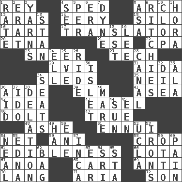 ACROSS 1. Marina Del _, California 4. Moved rapidly 8. Bowlike part 12. Ancient river in northeast Turkey 14. Suggestive of the supernatural 15. Grain storage tower 16. Small pie 17. Interpreter 20. Inactive volcano in Sicily 21. Compass dir. 22. Numbers guy (abbr.) 23. Contemptuous expression 27. Technician 29. 57 in ancient Rome 31. Opera by Verdi 34. Bobsleighs 35. Famous astronaut Armstrong 36. Helper 39. Shade tree 41. At sea 42. The content of cognition 43. Artist's stand 46. Stupid person 47. Loyal 48. American tennis player Robert 51. World-weariness 54. Fish or hair follower 56. Cuckoo 58. Riding implement 61. The property of being fit to eat 66. Globular water bottle used in Asia 67. Small Philippine buffalo 68. Haul 69. Against 70. Austrian-born American filmmaker Fritz 71. Roberta Peters solo 72. Male child DOWN 1. Assign a rank or rating to 2. Part of Q.E.F. 3. Tall tales 4. Put into a specified state 5. For each 6. Epoch 7. Unit of force 8. White ___ sheet 9. Actors Guy, Robert Welles, and Clint 10. Hoof sound 11. Israeli folk dance 13. Comedian Laurel of Laurel & Hardy 18. Fast jet (abbr.) 19. Area sheltered from the wind 24. Pipe bend 25. Night before a holiday 26. Travel on an animal 28. Lessep's creation 30. Small island 32. Expire 33. Wing 34. Theater features 36. Assist 37. Wedding promise 38. Accusation by an informer 40. Female horse 44. Player for Phoenix 45. Car or cant ending 49. Actor Linden 50. Compass dir. 52. Southern CA. univ. 53. Removes the wrinkles 54. Anneal 55. Pulitzer Prize-winning author Ferber 57. South American Indian 59. Von Bismarck 60. Ache 62. Paper or plastic container 63. Hearing organ 64. Indian title of respect (Mr.) 65. R.R. building