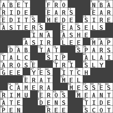 ACROSS 1. Collude with 5. From 8. Basketball assoc. 11. Travel on or in a vehicle 12. Hearing organs 14. Hearing organ 15. Proofreads 17. Ancient Persian 18. The founder of a family 19. Michaelmas daisies 21. Artist's stands 23. _ tizzy (2 wds.) 25. American tennis player Robert 26. SW Saudi Arabia district 27. Area sheltered from the wind 28. Atlas unit 31. Pat or tap gently 33. Make lace 35. Practice fights 37. Baby powder 38. Small drink 40. Jai _ 41. Came up 43. Three (prefix) 45. Insidious 46. Turn to the right 47. Affirmative reply 50. Hankering 52. Part of Q.E.F. 53. Cartoonist voice _ Blanc 54. Device for capturing images 56. Makes clutter 61. Tall New Zealand timber tree 62. Greek god of love 65. Intended 66. Had dinner 67. Cub Scout units 68. Periodic rise and fall of the sea level 69. Writing instrument 70. To sift 71. Highlander DOWN 1. Type of rug 2. Auction offers 3. Prepare for publication 4. False hair 5. Opposite of masc. 6. Actress Charlotte 7. Severe or trying experience 8. Famous astronaut Armstrong 9. Taverns 10. "We ___ not amused" (Victoria) 13. Gospel singer Marvin 16. Indian titles of respect 18. Observe 20. In a ____ (agitated or irritated) 22. "______ My Girl" (Turtles hit) 24. Caspian sea tributary 26. Lettered men learn these first 28. Promenade 29. Like ___ of sunshine 30. 23rd letter of the Greek alphabet 31. Have the gumption 32. _ vera 34. Teat (slang) 36. Romantic infatuation 37. Label 39. Demure 42. Jane of fiction 44. A distinct part 48. Having ears or earlike features 49. A viewer who gazes fixedly 51. Clement's nick name 52. Australian flightless bird 54. Quote 55. So be it 57. Puts into a specified state 58. Ketch in the Levant 59. Inside; within (prefix) 60. Proofreading order 61. Hit sharply and swiftly 63. Single 64. Compass dir.