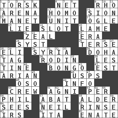 ACROSS 1. Cod relative 6. Fish or hair follower 9. 17th letter of the Greek alphabet 12. Sports stadium 13. Same (prefix) 14. The Jewish people; Israel 15. French painter Edouard 16. A single undivided whole 17. Stare at amorously 18. Untruth 19. Narrow, elongated depression 20. Unable to walk 21. Ardor 23. Period 24. System (abbr.) 25. Laconic 28. Connecticut Ivy Leaguer 30. Damascus' land 34. Capital of the state of Qatar 35. Label 36. "The Thinker" sculptor 38. French article 39. Prong on a fork 41. Beat drum 43. Eastern Standard Time (abbr.) 44. Believer in; advocate of (suffix) 46. United States Postal Service (abbr.) 48. Bear (Spanish) 49. A message received and understood 50. Ship's personnel 51. Hindu god of fire 53. For each 56. Silvers or Donahue 57. Blind as ____ 58. Tree or shrub in the Birch family 60. Perceives with the eye 61. Famous astronaut Armstrong 62. Wash lightly 63. Big collection agency 64. Call ___ day 65. Related on the mother's side DOWN 1. Scottish cap 2. Taken by mouth 3. Painter Guido (1575-1642) 4. Dwarf with a sinus problem 5. Krazy ___ of comics 6. Words to Nanette 7. Give off 8. Small child 9. Complicated, petty procedures 10. Opening into or through something 11. Single 13. Frame or body of a ship 14. Flew 19. Letch 20. Allow 22. Curvy letter 24. Seigniories (variant) 26. "______ My Girl" (Turtles hit) 27. Compass direction 28. Singer James 29. Den 31. Director Reiner 32. Wedding promise 33. The 18th letter of the Arabic alphabet 37. Group of southern Bantu languages 40. Artist's stands 42. Order of Saint Francis (abbr.) 45. At this time 47. Cotton for raincoats, e.g. 49. International (abbr.) 50. "Mermaids" star 51. Collude with 52. Greek goddess of the earth (variant) 54. Pulitzer Prize-winning author Ferber 55. Remainder 56. 23rd letter of the Greek alphabet 57. Cuckoo 58. "We ___ not amused" (Victoria) 59. To separate or throw off