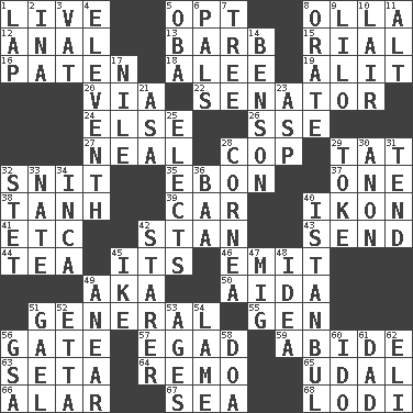 ACROSS 1. Not recorded 5. Choose 8. Spanish pot 12. Of or related to the anus 13. Sharp remark 15. Monetary unit of Yemen 16. Eucharist need 18. Toward shelter 19. Set down 20. By way of 22. Elected representative 24. Otherwise 26. Compass dir. 27. Be tempered by heat 28. Police officer (slang) 29. Make lace 32. In a ____ (agitated or irritated) 35. Inky black, to poets 37. Single 38. Hyperbolic tangent 39. 4-wheeled motor vehicle 40. Image 41. And so on (abbr.) 42. Comedian Laurel of Laurel & Hardy 43. Post 44. Afternoon social gathering 45. It is 46. Send forth 49. Alias (abbr.) 50. Opera by Verdi 51. Commissioned military rank 55. Commissioned military rank (abbr.) 56. Yard entry 57. Mild oath 59. Tolerate 63. Stalk of a moss capsule 64. San ____ (Riviera town) 65. Hereditary estate 66. Having or resembling wings 67. Ocean 68. Farming town in central California DOWN 1. Infant locale 2. _ tizzy (2 wds.) 3. Large container 4. Veterans Day date 5. Chief or king in Benin or Nigeria 6. Friends 7. Family _ (genealogy) 8. Speak pompously 9. _ and Stitch 10. Den 11. Keyboard modifier key 14. Gillaume's butler role 17. Mediterranean tributary 21. White ___ sheet 23. Cleo's killer 25. Opts 28. Pupil covering 29. Casino tip 30. Soon (poet.) 31. Be inclined (to) 32. Proofreading order 33. Nathan's nickname 34. South American Indian 36. Sound made by sheep 40. Byzantium, centuries later 42. A viewer who gazes fixedly 45. Eisenhower's nickname 47. Russian fighter aircraft 48. The main thing one is thinking about 49. Approach 51. Highlander 52. Singer James 53. Matures 54. Unable to walk 56. Girls' org. (abbr.) 58. ___ good deed 60. Wedding promise 61. June honoree 62. Connecticut Ivy Leaguer