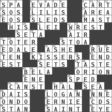 ACROSS 1. Health resort 4. Dodge 9. Heavy open wagon 13. Mayday 14. Ms. Damita and namesakes 15. Length times width 16. Greek goddess of the dawn 17. Bobsleighs 18. Vertical spar for supporting sails 19. Part of HMS, perhaps 21. Flowery wreath 22. Take or capture by force 24. Stalk of a moss capsule 26. Atmosphere 27. Carrier 29. Portico 30. Peak District village in England 31. American tennis player Robert 33. Sorrow 36. Nine, plus one 37. Smoochers 40. Conclude 41. Eastern Standard Time (abbr.) 42. Arranges properly for use 43. Clothes sense 45. Actor Lugosi 47. Greek mythologigal hunter 48. Compass dir. 49. Hurried 50. 2nd pers. sing. pres. of can (arch.) 52. Actor Linden 54. Ocean 56. Raised platform 57. Utah city north of Ogden 59. Compass dir. 61. Southwest Nigerian state 62. Bert's buddy 63. Music discs 64. Comedian Laurel of Laurel & Hardy 65. Inhabitant of Heaven 66. Sight organ DOWN 1. Compass dir. 2. "Silly old bear" 3. Helper 4. Raised railways 5. Country estate 6. Toward shelter 7. "You Light Up My Life" star Conn 8. Double-curved letter 9. Device for capturing images 10. Ancient river in northeast Turkey 11. Remainder 12. Make lace 20. Sew up the eyelids of hawks and falcons 22. Wetness 23. River (Sp.) 25. Long journey 27. False hair 28. Lyric poems 29. "______ My Girl" (Turtles hit) 31. Toward the sea 32. Fast jet (abbr.) 33. Home 34. To (old English) 35. Paradise 38. Small island 39. Close up, plug up 44. Ancient Greek god of war 45. Gillaume's butler role 46. Followers of ems 49. Killed 50. Patter 51. Opera by Verdi 52. Israeli folk dance 53. Hindu god of fire 55. Actor Griffith 56. Two (Sp.) 57. French article 58. Fish or hair follower 60. Compass dir.