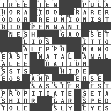 ACROSS 1. Family _ (genealogy) 5. Nine, plus one 8. Monetary unit of Botswana 12. Israeli folk dance 13. Wedding promise 14. More valued for its uncommonness 15. Scent 16. One who advocates reunion 19. To free from 20. Pre-World Series prize 21. Delicate 23. E Mali city 24. Put into a specified state 27. Hats (slang) 30. "Tell ____ the Marines!" 31. City in Syria 34. Billionth: prefix 35. Compass direction 38. Brizilian seaport 40. Of or related to the anus 41. Toward shelter 42. Food allowance for one day 44. Fast planes 45. Flintstone garb 46. Greek goddess of the dawn 47. Electrical Unit 50. Celtic language 53. More impudent 57. Eastern Standard Time (abbr.) 59. Appease 63. Stalk of a moss capsule 64. Bake eggs in their shells 65. Slender fish 66. Drove too fast 67. Lacquered or enameled metalware 68. Playfully artful 69. Snake ____ (dice throw) DOWN 1. Son of Odin 2. "The Thinker" sculptor 3. Wear away 4. Hearing organ 5. Become fatigued 6. Paradise 7. Part of speech 8. Baking dish 9. RI univ. 10. French article 11. Nonscientific branch of learning 14. Printing process, for short 17. Tired old horse 18. _ tizzy (2 wds.) 20. Silvers or Donahue 22. Chalkboards 24. Comedian Laurel of Laurel & Hardy 25. Inactive volcano in Sicily 26. Instrument 28. Lair 29. Coast Guard woman 30. More lacking in sense or substance 32. Parent Teacher Assoc. 33. Pledge 35. Comfort 36. In addition 37. Arranges properly for use 39. Cards in a Roman deck? 43. Baltic tributary 47. SW Saudi Arabia district 48. Floor covering 49. Air pressure measure (abbr.) 51. Oozy 52. First name in cosmetics 54. Sinks 55. Slanted text style (abbr.) 56. Suggestive of the supernatural 58. Small boys 59. Pacific Standard Time (abbr.) 60. 17th letter of the Greek alphabet 61. Petroleum 62. Before (prefix) 63. Compass dir.