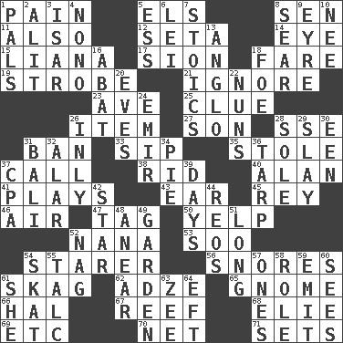 ACROSS 1. Ache 5. Raised railways 8. Elected rep. 11. In addition 12. Bristle 14. Sight organ 15. Woody, climbing, usually tropical plant 17. The Jewish people; Israel 18. Conductor's collection 19. Disco prop 21. Disregard 23. "___ Maria" 25. A slight indication 26. Detail 27. Boy, to dad 28. Compass dir. 31. Prohibit 33. Small drink 35. Fur scarf 37. Give a ring to 38. To free from 40. ____ Jay Lerner 41. Frolics 43. Hearing organ 45. Marina Del _, California 46. Atmosphere 47. Label 50. Sharp bark 52. Grandmother 53. "Barney Miller" actor Jack 54. A viewer who gazes fixedly 56. Sounds asleep 61. Heroin 62. Edge tool used to cut and shape wood 65. Dwarf 66. Actor Linden 67. Coral ridge 68. Writer Wiesel 69. And so on (abbr.) 70. Fish or hair follower 71. Puts into a specified state DOWN 1. Friends 2. Set down 3. Austrian river, tributary to the Danube 4. Words to Nanette 5. Double-curved letter 6. Luau accessory 7. Unemotional ones 8. Singe 9. Jane of fiction 10. Born 13. White American of non-Hispanic descent 16. Blind as ____ 18. Enemy 20. Nights before holidays 22. Religious women 24. Independent ruler or chieftain 26. In an inward manner 28. Not divided or shared with others 29. Kill 30. Car or cant ending 31. Indonesian resort city 32. Having or resembling wings 34. Sliced dessert 36. Canvas cover 37. Accounting whiz (abbr.) 39. 24-hour periods 42. Play the lead 44. Vintage cars 48. Approach 49. Place where plants grow 51. Yearn 52. Tired old horse 54. Three-handed card game 55. Baby powder 57. Washington bills 58. Hero or heavy, e.g. 59. Send forth 60. Observes 61. A female animal or person 63. Last letter of the English alphabet 64. Newt