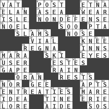 ACROSS 1. Large container 4. Mail 8. Inactive volcano in Sicily 12. Flair 14. At sea 15. Erode 16. Small island 17. Unrelated to defense, as in spending 20. Christmas carol 21. "Barney Miller" actor Jack 22. Parent Teacher Association (abbr.) 23. Hits or strikes with great force 27. Sense of smell 29. Small bottle 31. Leg joint 34. Canadian anthropologist Darnell 35. Lodging establishments 36. Hindu Mythology: god of death 39. What Jean-Claude Killy likes to do 41. Sight organs 42. One who makes use of a thing 43. _____ Park, CO 46. Yawn 47. Water falling in drops from the sky 48. NW Algerian seaport 51. Musical pauses 54. Or not 56. Unit of force equal to gravity 58. Tenement units (abbr.) 61. Pleas 66. Female horse 67. The content of cognition 68. Prong on a fork 69. One of the Great Lakes 70. Old wives' tales, e.g. 71. Assistant 72. Distress signal DOWN 1. Distinctive style or manner 2. In addition 3. Stories 4. Baking dish 5. Bear (Spanish) 6. Elected rep. 7. Small amounts or degrees 8. She-sheep 9. 3-inch nail 10. Political cartoonist Thomas 11. Type of rug 13. 1994 drama film starring Jodie Foster 18. A really long time 19. Egg _ yung 24. "___ Maria" 25. Russian fighter aircraft 26. Without 28. Atmospheres 30. Member of a famous L.A. basketball team 32. Compass dir. 33. Double-curved letter 34. More uncommon 36. Large cup 37. White ___ sheet 38. News announcer 40. Austrian river, tributary to the Danube 44. Standoff 45. Followers of ems 49. Mature 50. Teachers' org. 52. Docile 53. Practice fights 54. Famous astronaut Armstrong 55. Southwest Nigerian state 57. Singer James 59. Musical group of three 60. Observes 62. Actress Charlotte 63. One more than two 64. Conclude 65. Perceive with the eye