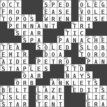 ACROSS 1. Sep. follower 4. Broke a traffic law 8. Cassini of fashion 12. From 13. Relaxation 14. Short-tailed, large-bodied rat 15. Literary convention 18. Songbird 19. Celtic language 20. Pre-World Series prize 22. Three (prefix) 23. Scorch 24. Nervous spasm 25. Health resort 26. Flamboyance 30. Beverage made from leaves 33. Having a sole or soles 36. Oscar Madison type 37. Arab leader 39. ___ good deed 40. "Corrida" creature 41. Helper 42. Stone: prefix 44. Baking dish 45. Paper fasteners 47. It would 50. Boat paddle 51. Negative votes 53. Globe 54. Short socks 57. Waist strap 59. Goldbrick 61. Proofreads 63. Small island 64. Part of Q.E.F. 65. Untruth 66. Play the lead 67. Portable shelter 68. Epoch DOWN 1. Often (poetically) 2. Riding implement 3. Drinks excessively 4. Stitched 5. Piece 6. Compass dir. 7. Lair 8. Cloudy 9. Australian parrot (variant) 10. Raised railways 11. Turn to the right 16. Singles 17. Fastener 21. Ancient river in northeast Turkey 22. Shallow baking pan 24. Small amount or degree 26. Lightbulb-shaped fruit 27. Hoof sound 28. Israeli folk dance 29. Inky black, to poets 30. Beverages made from leaves 31. Give off 32. Opera by Verdi 34. Lyric poems 35. Car dealer's back yard 38. Newsperson 42. For each 43. Pig sound 46. Experiment locale 48. Falsehood 49. Colored 52. Vertical member of a panel or frame 53. Water jar 54. Muslim summons to prayer 55. Remaining after all deductions 56. Use a swizzle stick 57. Again 58. Eastern Standard Time (abbr.) 59. Allow 60. "We ___ not amused" (Victoria) 62. Ocean