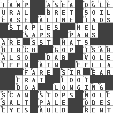 ACROSS 1. Pack (down) 5. Toward the sea 9. Stare at amorously 13. Mountain range 14. Cy Young winner Saberhagen 15. The visible part of the earth's surface 16. Comfort 17. Place in a line 18. Small boys 19. Paper fasteners 21. Cartoonist voice _ Blanc 22. Plant excrements 23. Zero-star reviews 24. "We ___ not amused" (Victoria) 27. Fast jet (abbr.) 28. Floor coverings 29. A tree used for making furniture 31. Republican Party 32. Austrian river, tributary to the Danube 36. In addition 37. Pat or tap gently 38. Short-tailed, large-bodied rat 39. Adolescent 40. The 18th letter of the Arabic alphabet 41. Chap (slang) 42. Conductor's collection 44. Title for a knight 46. Hearing organ 47. Part of Q.E.F. 48. Spoils 50. ___ good deed 51. Yearning 54. Skim 56. Closes up, plugs up 58. Undercover agent 60. Table seasoning 61. Diluted with white 62. Lyric poems 63. Sight organs 64. Old (Scot.) 65. Monthly bill DOWN 1. Third day of the wk. 2. Ancient river in northeast Turkey 3. Vertical spar for supporting sails 4. Entreaties 5. Most capable 6. Indian titles of respect 7. Car or cant ending 8. Had dinner 9. Clearly or manifestly demonstrative 10. Scores awarded for successful feats 11. Hat (slang) 12. Raised railways 17. High mountains 20. Romantic infatuation 21. Floor protector 23. Infant food 24. Blind as ____ 25. Cause heat under the collar 26. Celtic language 28. Crowd into 30. Meets 31. Separate the seeds from cotton 33. Not divided or shared with others 34. Silent film actress Nazimova 35. Tail end 37. Expire 40. Nonscientific branch of learning 41. Toadlike animal 43. American Automobile Association (abbr.) 44. Had an oblique or slanted direction 45. Charged atoms 47. Peak District village in England 49. Southeast Indonesia island 51. Hang loosely or laxly 52. Connecting point 53. Small, secluded valley 54. Compass dir. 55. Island 56. Health resort 57. The 19th letter of the Greek alphabet 59. Eastern Standard Time (abbr.)