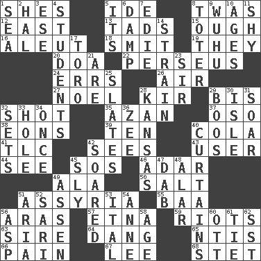ACROSS 1. "______ My Girl" (Turtles hit) 5. Binary compound 8. It was, poetically 12. 90 degrees 13. Small boys 15. Ending for "Through" and "Enough" 16. Eskimo relative 18. Stricken, poetically 19. Those people 20. ___ good deed 22. Son of Zeus who helped slay Medusa 24. Blunders 26. Wind 27. Christmas carol 28. Apertif with cassis 29. Twice 32. Attempt 35. Muslim summons to prayer 37. Bear (Spanish) 38. Immeasurably long periods of time 39. "___ Little Indians" 40. Root beer relative 41. Affectionate concern, for short 42. Perceives with the eye 43. One who uses or employs something 44. Observe 45. Distress signal 46. The sixth month of the Jewish calendar 49. In the manner of 50. Table seasoning 51. Nineveh was its capital 55. Sound made by sheep 56. Caspian sea tributary 57. Inactive volcano in Sicily 59. Disturbances 63. Male parent of an animal 64. Mild oath, euphamism for damn 65. Nuclear Threat Initiatives 66. Ache 67. Area sheltered from the wind 68. Proofreading order DOWN 1. Ocean 2. Actor Linden 3. Compass dir. 4. SAT takers 5. ___ a Wonderful Life 6. Moist 7. Singer Brickell 8. Carrier 9. Chinese city south-southwest of Nanjing 10. Grows older 11. Like a shrinking violet 14. Put through a sieve 17. "Corrida" creature 21. "We ___ not amused" (Victoria) 23. Title for a knight 25. Chalkboards 28. Sunflower state 29. Expressions of contempt or scorn 30. Capri or Wright 31. Fly high 32. Arranges properly for use 33. Hollow 34. Single time 36. Last letter of the English alphabet 40. Window treatments 42. Flew 45. Stealthy 47. Pat or tap gently 48. Having or resembling wings 49. NE Netherlands city 51. Roberta Peters solo 52. Indian skirt 53. Slanted text style (abbr.) 54. Singer Murray 56. Cleo's killer 58. Grow older 60. Baseball player Mel 61. Standoff 62. Fast jet (abbr.)