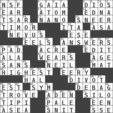ACROSS 1. Overdraft (abbr.) 4. Greek goddess of the earth (variant) 8. "Vaya con ____" 12. Hearing organ 13. Tiny particle 14. Pulitzer Prize-winning author Ferber 15. Russian ruler of old 17. Billionth: prefix 18. Scornful expression 19. The easternmost of the Lesser Sundas 21. Call ___ day 23. White ___ sheet 24. Congenital growth or mark on the skin 26. Compass dir. 28. Snakelike fish 30. Replies 34. Groovy apt. 37. Measure of real estate 39. Prepare for publication 40. Wing 41. Puts on (as clothing) 43. Grow older 44. Without 46. Famous astronaut Armstrong 47. Floor covering 48. Having the greatest elevation 51. Suggestive of the supernatural 54. Actor Linden 55. A piece of turf (Scot.) 58. Eastern Standard Time (abbr.) 61. Symbol (abbr.) 63. Debunk (Brit. slang) 65. Collection of objects 67. An important port of Yemen 71. Grain storage tower 72. Native american tent (variation) 73. Diluted with white 74. Car or cant ending 75. At sea 76. In a ____ (agitated or irritated) 77. Compass dir. DOWN 1. Remaining after all deductions 2. Indian antelope 3. Movie unit 4. Separate the seeds from cotton 5. "One Day ___ Time" 6. Electrically charged atom 7. Mine, in Marseilles 8. Lair 9. The main thing one is thinking about 10. Singles 11. "Two Mules for Sister ____" 16. Be footloose 18. Backtalk 20. Sorrow 22. "___ Little Indians" 25. Cole _ (cabbage dish) 27. She-sheep 29. Aroma 30. Nest on high 31. Dutch treat 32. Capital of Latvia 33. Proofreading order 34. Romantic infatuation 35. Jai _ 36. Mild oath, euphamism for damn 38. Actress Charlotte 42. Downhill vehicle 45. Quiet! 49. Relaxation 50. Wily 52. To free from 53. Jacques Cousteau's middle name 56. Off-Broadway awards 57. Lies 58. Singer James 59. Indian titles of respect 60. Drink excessively 62. Atlas contents 64. Went 66. By way of 68. One of the 12 tribes of Israel 69. Connecticut Ivy Leaguer 70. Fish or hair follower